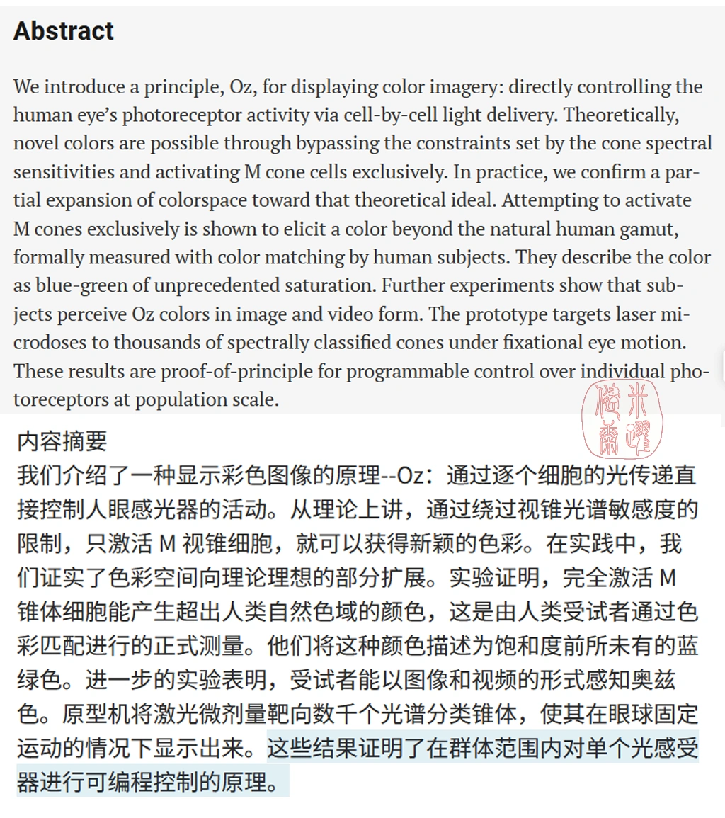 更令人兴奋的是,Oz技术不仅仅是一场色彩的革命,它更是视觉科学研究的一把新钥匙。通过精确控制视网膜上的每一个光感受器,科学家们能够深入探索颜色感知的奥秘,甚至可能揭开人类视觉可塑性的神秘面纱。