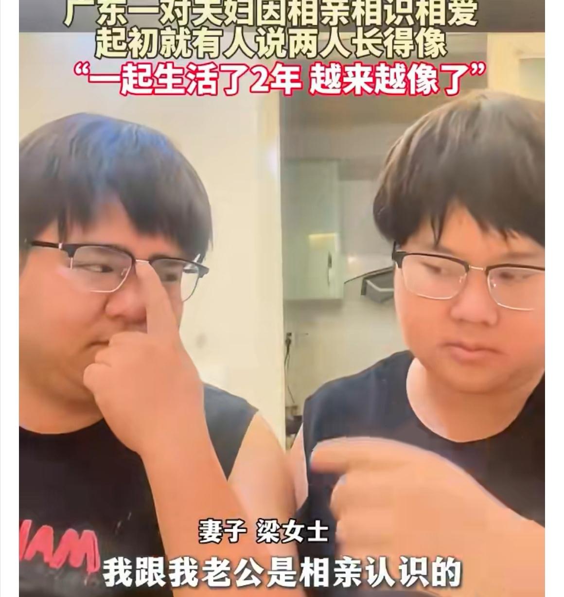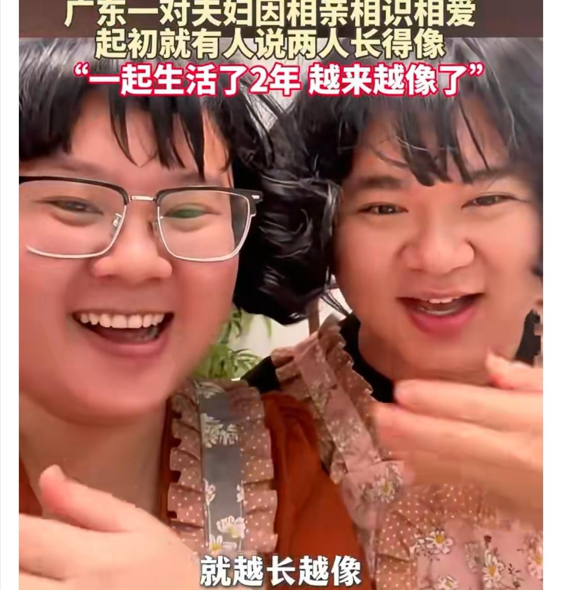 你能想象吗?10月5日广东东莞有对相亲认识的夫妇,因为长得太像直接火出圈了!刚认识就被人说像,生活两年多后,简直就是复制粘贴的一样。 有人说,这夫妻相是因为生活习惯、神态的磨合,也有人说是基因选择的相似性。不管怎样,在生活中,我们确实能看到很多夫妻在一起久了,从面容到行为都越来越像。 就像之前有对夫妻,他们喜欢一起运动,一起吃健康餐,几年下来,身材和气质都越来越相似,走在街上别人都以为他们是兄妹。还有一对夫妻,都喜欢安静看书,待人接物都很温和,时间长了,那神态和气质,简直如出一辙。 其实啊,夫妻相不仅是外貌的相似,更是生活中相互影响、相互陪伴的一种体现。这对夫妇如此相似,走在街上,被当成双胞胎真的一点都不奇怪。他们之间的这种相似,也是他们感情深厚、生活和谐的一种见证。 以后走在街上,看到那些有夫妻相的人,或许我们能想到,这背后是他们共同生活的点点滴滴,是彼此生命中的温暖陪伴。这样的夫妻相,真的很美好,也让人羡慕。
