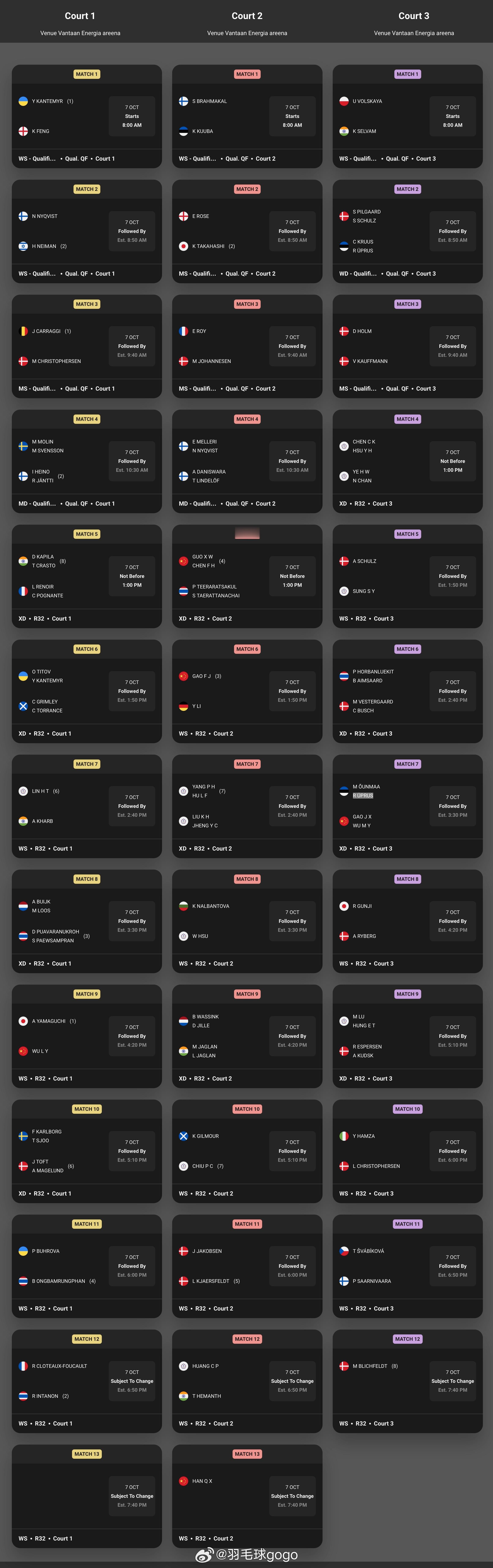 2025年北极羽毛球公开赛 10月7日国羽赛程:正赛从第五场开始,时间不早于18点(北京时间)