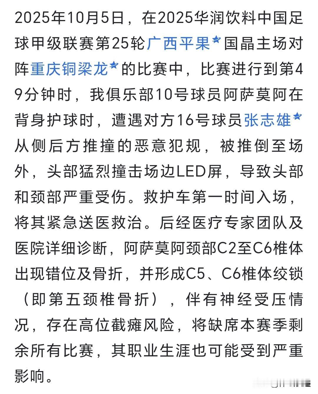 一名球员一场比赛造成对方两名球员重伤,难道不是恶意犯规?裁判执法如何判罚的?难道球场就是法外之地?球员就能为所欲为?还是希望中国足协引起高度重视,认真调查处理,还绿茵场一个平安公正的比赛环境!!!