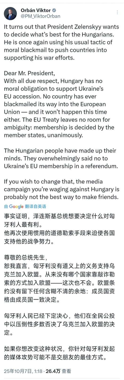 匈牙利总理欧尔班今天(北京时间10月7日)对泽连斯基强硬喊话:“匈牙利没有道义上的义务支持乌克兰加入欧盟。从来没有哪个国家靠敲诈勒索的方式加入欧盟,这次也不会。” 欧尔班这次对泽连斯基的强硬表态,本质上是匈牙利国家利益与欧盟战略博弈的集中爆发。 欧尔班在喊话中反复强调的"欧盟条约规定成员国资格需一致同意",可不是简单的外交辞令,而是实实在在攥在手里的否决权王牌。 这场公投背后是匈牙利人对自身命运的深刻焦虑。作为欧洲内陆国家,匈牙利80%的石油依赖俄罗斯"友谊管道"输送,而这条管道在俄乌冲突中多次遭到乌克兰无人机攻击。 这种切肤之痛让匈牙利人清醒认识到:一旦乌克兰加入欧盟,根据《里斯本条约》第42条第7款,匈牙利可能被迫卷入与俄罗斯的直接军事对抗。欧尔班那句"不愿让匈牙利青年为乌克兰流血"的表态,说出了无数家长的心声。 更让匈牙利人愤怒的是乌克兰对其少数民族权益的漠视。在外喀尔巴阡州这片历史上曾属于匈牙利的土地上,15万匈牙利族人至今仍在为使用母语教育的权利抗争。 2017年乌克兰通过的《教育法》强制所有学校使用乌克兰语教学,导致当地匈牙利族学校数量锐减40%。匈牙利政府多次向乌克兰提交包含11点要求的备忘录,却只换来泽连斯基"匈牙利觊觎领土"的指控。 这种文化压制彻底点燃了匈牙利人的民族情绪,欧尔班的强硬立场在国内获得了92%的支持率。 欧盟内部的决策机制改革进一步激化了矛盾。德法等国正在推动将外交政策表决从"一致同意"改为"有效多数",这意味着匈牙利的否决权可能被架空。 对此欧尔班早有准备,他在欧盟峰会上公开警告:"如果布鲁塞尔剥夺我们的否决权,匈牙利将重新考虑留在欧盟的意义。"这种威胁并非虚张声势——匈牙利已经联合斯洛伐克、波兰等国成立"维谢格拉德集团",形成了对抗欧盟集权的坚固阵线。 在能源安全问题上,匈牙利展现出破釜沉舟的决心。尽管欧盟施压要求切断与俄罗斯的能源联系,匈牙利却反其道而行之:与俄罗斯签署有效期至2037年的天然气合同,加速扩建依赖俄罗斯技术的保克什核电站,甚至计划投资2300亿福林建设绕过乌克兰的新石油管道。 这种"能源自主"战略让匈牙利在欧盟制裁浪潮中独善其身,却也招致乌克兰的强烈不满。泽连斯基多次在国际场合指责匈牙利"充当俄罗斯的能源走廊",但匈牙利外长西雅尔多的回应掷地有声:"我们不会为了别人的战争牺牲自己的经济命脉。" 这场外交冲突的背后,是两种截然不同的欧洲观在碰撞。欧尔班代表的中东欧国家认为,欧盟应该是主权国家的联盟而非超国家实体;而德法主导的西欧集团则试图将欧盟改造成类似联邦的政治实体。 这种理念分歧在乌克兰入盟问题上达到顶点——匈牙利坚持"宁缺毋滥"的入盟标准,而欧盟委员会却想将乌克兰纳入"快速通道"。欧尔班在联合国大会上尖锐指出:"一个仍在交战的国家加入欧盟,只会把整个欧洲拖入战争泥潭。" 值得关注的是,匈牙利的立场正在改变欧洲政治版图。斯洛伐克新政府已经明确表示支持匈牙利的否决权,波兰国内要求重新评估对乌援助的声音也日益高涨。 这种连锁反应让欧盟领导层坐立不安——如果匈牙利的否决权被突破,接下来可能引发西巴尔干国家入盟的连锁反应,欧盟的扩张计划将彻底失控。 面对欧盟的施压,欧尔班展现出高超的政治智慧。他一方面在欧盟峰会上寸步不让,另一方面积极拓展"向东开放"战略:与中国签署价值73.4亿欧元的宁德时代电池工厂协议,与土耳其达成天然气过境合作,甚至在联合国大会上与印度、巴西等新兴国家共同呼吁和平谈判。 这种多极外交策略让匈牙利在东西方博弈中找到了生存空间,也让欧盟意识到不能轻易将其边缘化。 泽连斯基试图通过媒体攻势改变匈牙利立场的做法,反而起到了反效果。乌克兰媒体对匈牙利的持续攻击,被欧尔班巧妙转化为国内政治资本。 这种民粹主义动员让匈牙利社会空前团结,民意调查显示,78%的匈牙利人支持政府继续否决乌克兰入盟申请。 这场外交风暴最终可能成为欧盟改革的转折点。如果德法坚持强行推动多数表决制,可能导致欧盟分裂加剧;而如果尊重匈牙利的否决权,则意味着欧盟东扩战略将长期停滞。 无论结果如何,欧尔班已经用实际行动证明:在这个充满不确定性的时代,小国也能通过坚定的立场和灵活的策略,在大国博弈中捍卫自身利益。而乌克兰入盟问题,不过是这场欧洲秩序重构大戏的开场锣鼓罢了。