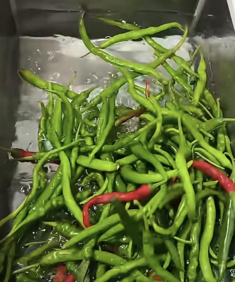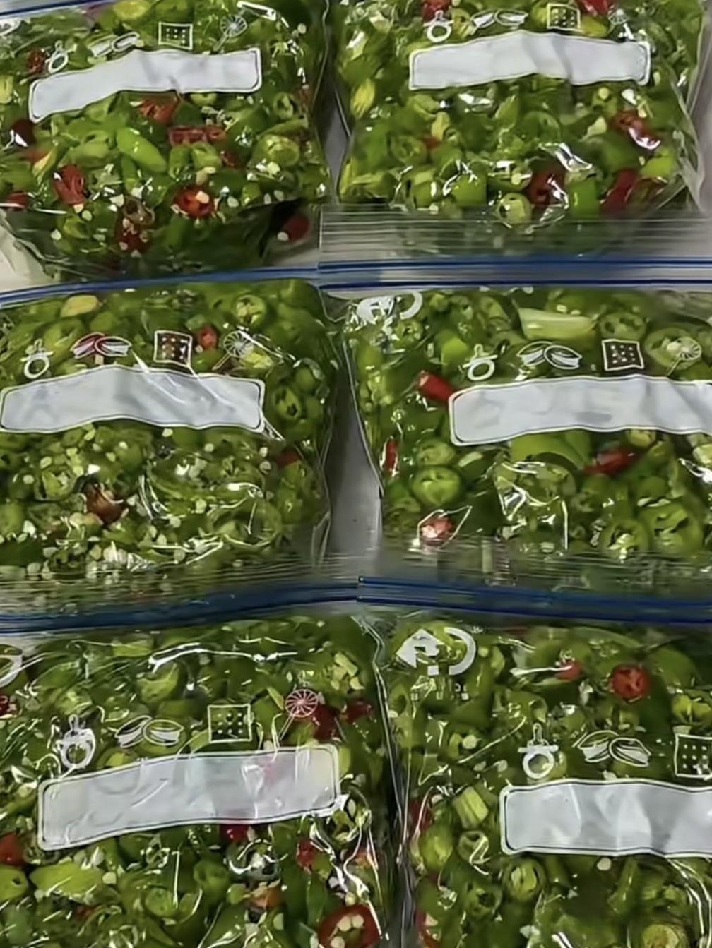 辣椒买多不要愁,教你3招储存小技巧,放一年都不会坏,跟新鲜一样好吃,过年再也不怕辣椒涨价了! 我们在选择辣椒时,要选择新鲜翠绿,无损伤,果形饱满硬挺,捏起来不发软的。 把辣椒清洗干净,自然晾晒或用厨房纸巾擦干辣椒表面上的水分。再把辣椒去蒂,切圈或切块都可以,切好装入盆中备用。 锅中倒入1大勺食用油,把油烧热后关火,将油放凉。然后把放凉的熟油倒入装有辣椒的盆中,戴上手套抓拌均匀。 再把抓拌均匀的辣椒装入保鲜袋,一顿吃多少装多少。按压排出空气(一定要把袋子里面的空气排干净)把口密封好,放入冰箱冷冻保存就可以了。 冬天吃的时候,无需解冻。炒着吃跟夏天新鲜的一样好吃!#辣椒小技巧# #如何储存辣椒# #辣椒储存法#