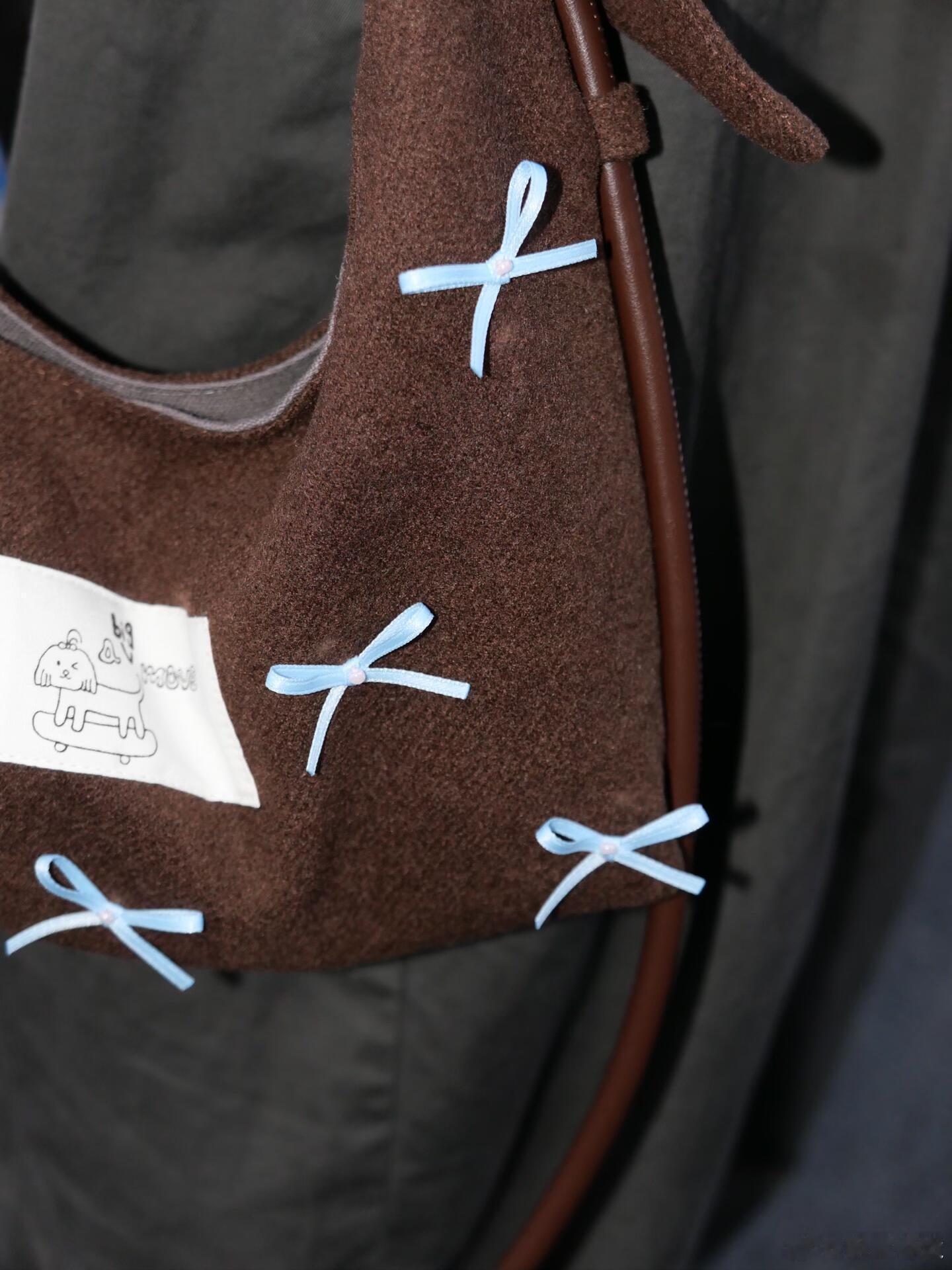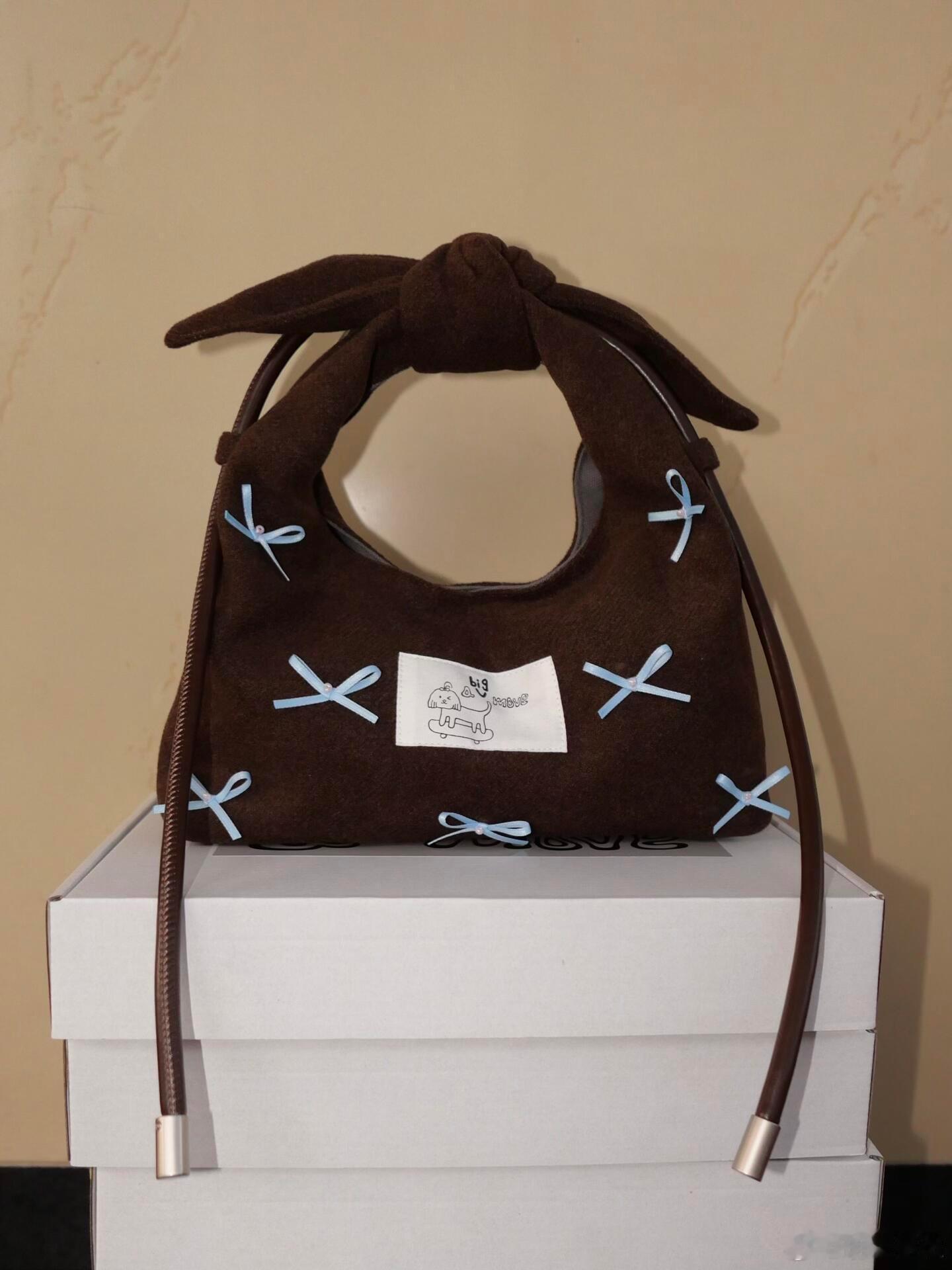 一款设计感极强的深棕色手提包,其最大的亮点在于包身正面装饰的多个浅蓝色缎面蝴蝶结