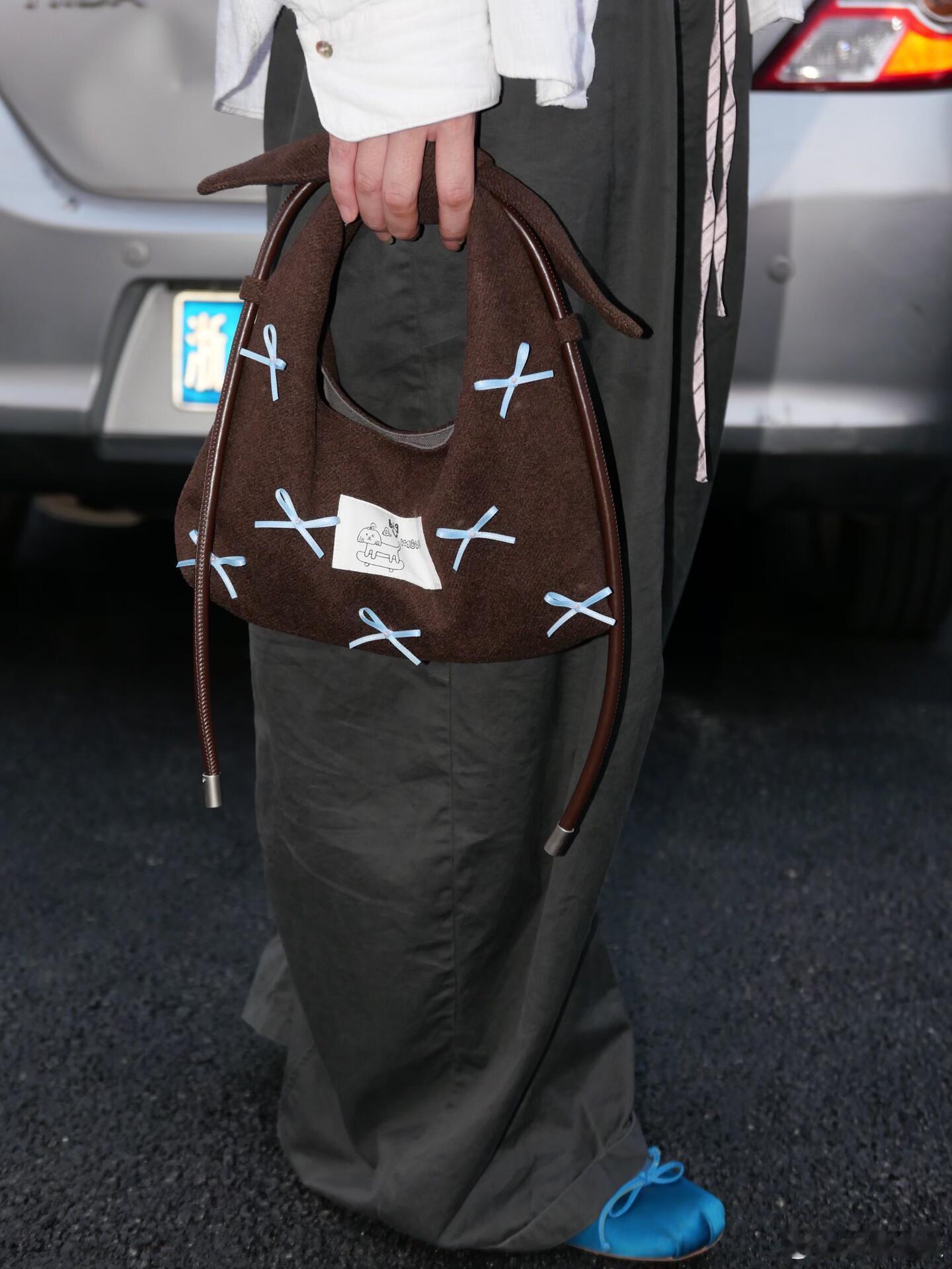 一款设计感极强的深棕色手提包,其最大的亮点在于包身正面装饰的多个浅蓝色缎面蝴蝶结。这些大小不一的蝴蝶结错落排列,与一枚可爱的卡通图案布标共同营造出俏皮又独特的少女气息。包体采用柔软的廓形,搭配弧形提手,显得随性而不失精致。更巧妙的是,穿着者的宝蓝色缎面平底鞋与手提包形成了完美的色彩呼应,鞋面上的蝴蝶结装饰更是将整体造型的搭配巧思推向高潮。这套组合超越了单纯的实用功能,成功将配饰提升为造型的核心,展现出一种简约时尚又充满玩心的混搭风格。时尚配饰