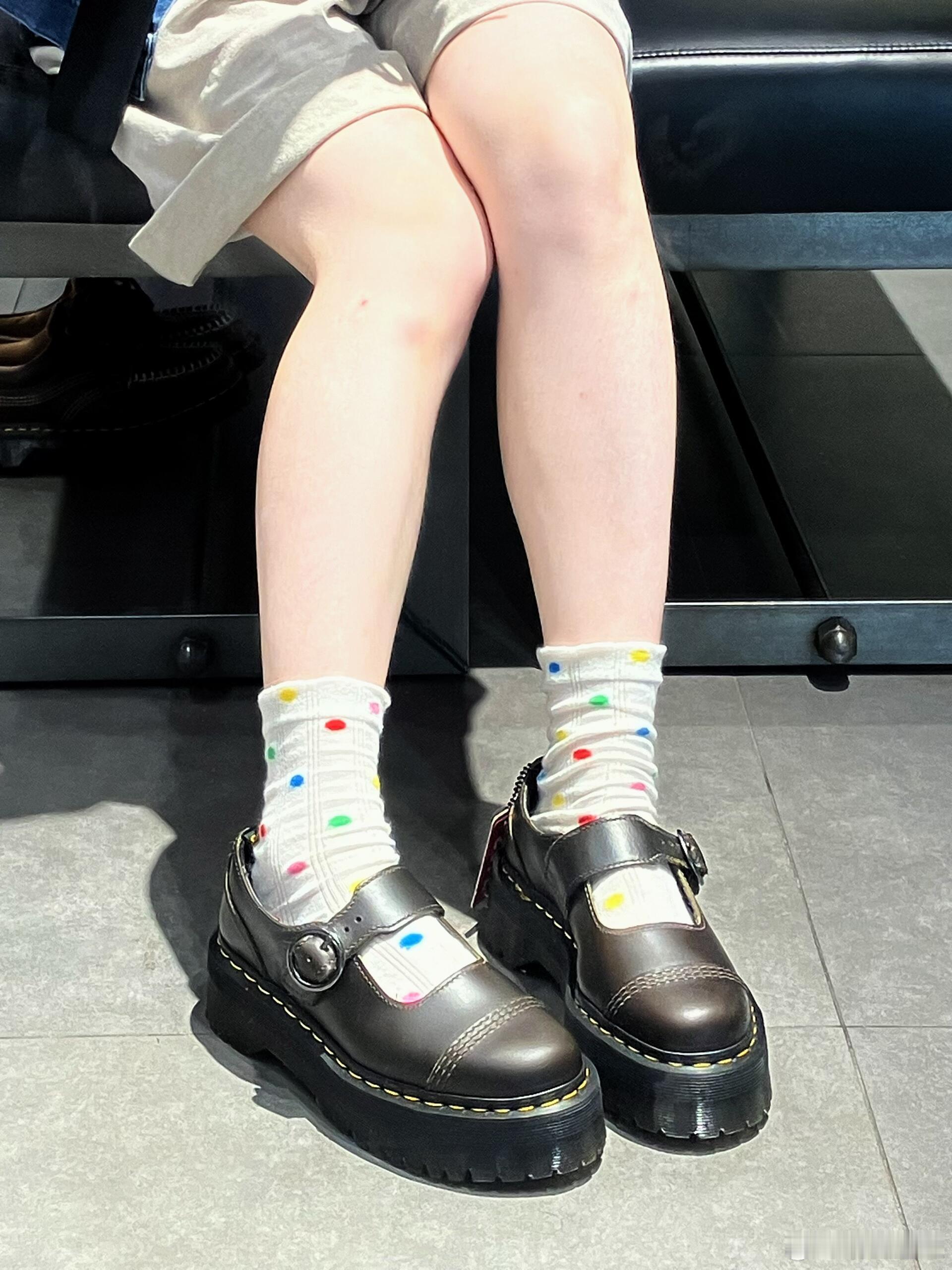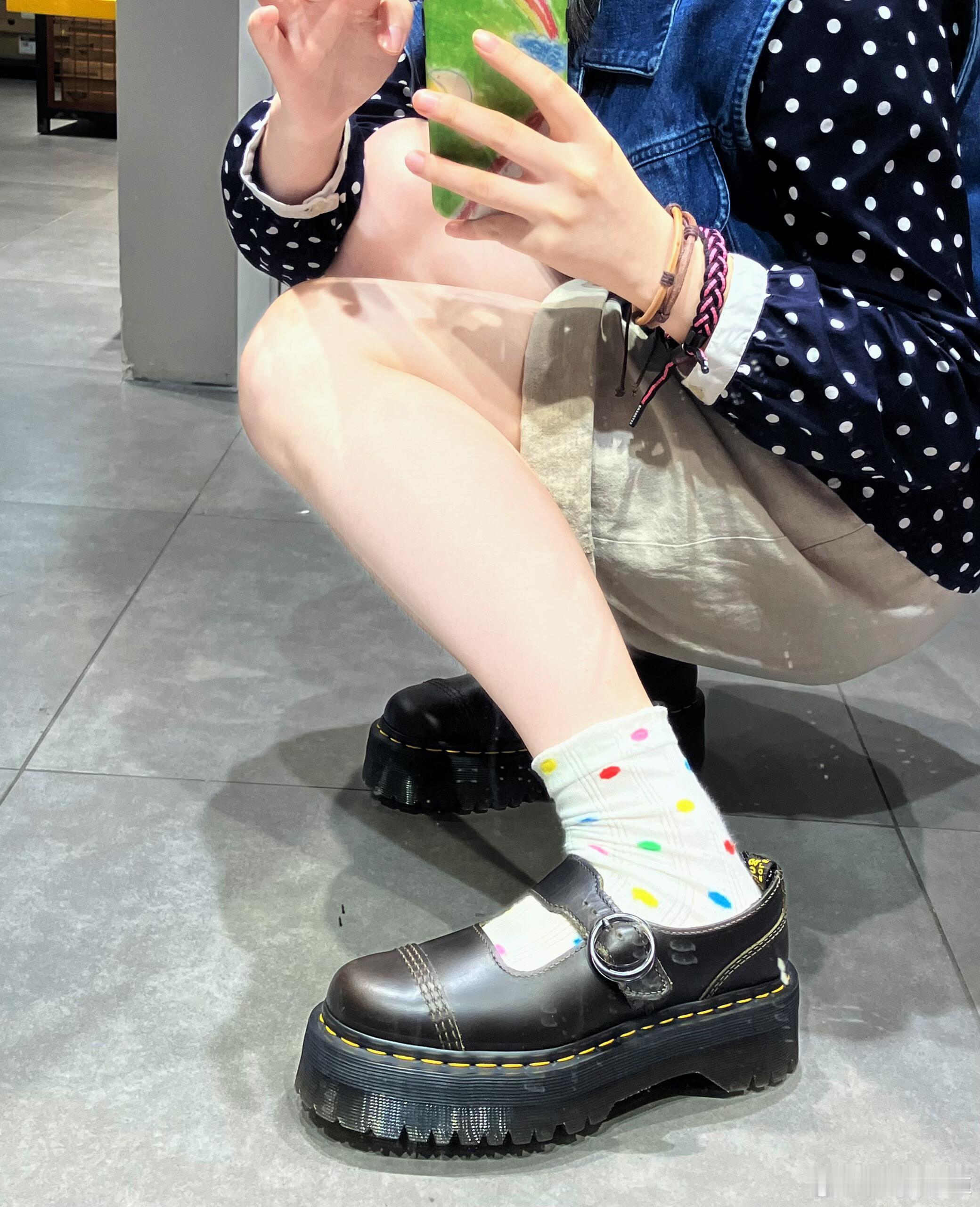 这双鞋是典型的厚底马丁靴风格,深棕色光面皮革鞋身搭配醒目的黄色缝线,质感硬朗复古。其最显著的特征是超厚的锯齿状橡胶大底,不仅提供了极佳的缓震效果,更塑造了强烈的朋克摇滚气质。鞋面的搭带与金属扣环装饰,在实用之余增添了不羁的细节亮点。模特以白色波点袜搭配,巧妙中和了鞋子的厚重感,注入一丝俏皮活力。整体穿搭融合了牛仔、波点等元素,与靴子共同构建出个性鲜明的街头复古风格。这双鞋既是增高的利器,也是彰显独特时尚态度的标志性单品,非常适合追求个性表达的潮流爱好者。时尚鞋履