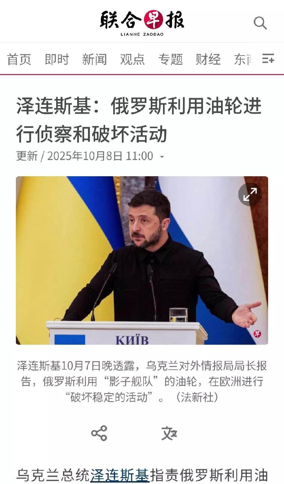 [泽连斯基说,俄罗斯利用油轮作为"影子舰队"] 据联合早报今晨消息(见下图): 泽连斯基说,俄罗斯军舰不够用了,开始把油轮武器化。不仅从油轮上发射无人机,还用油轮在欧洲刺探情报,侦察欧洲各地的军备移动情况。 这确实是个新情况,油轮是输送出售战略资源支撑战争的。按泽连斯基的意思,是不是准备让炮弹追着毛子油轮打? 其实泽连斯基也没必要大惊小怪,战争非常时期,油轮的多栖用途是必然的。