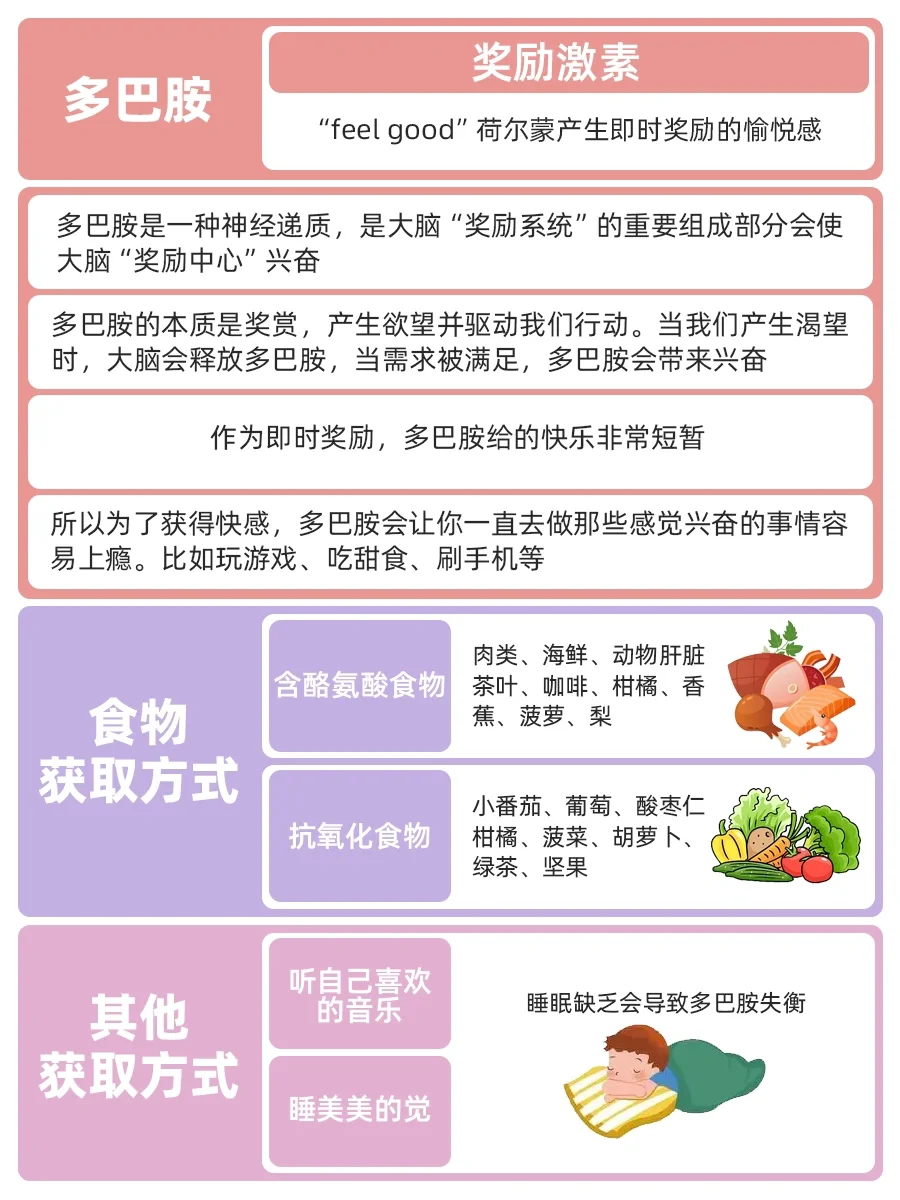 多巴胺是通过体验欲望得到满足的感觉使你快乐的,满足欲望虽然简单,但也会令人依赖上瘾,为日后埋下隐患,因此,要想办法获得健康的多巴胺哦~