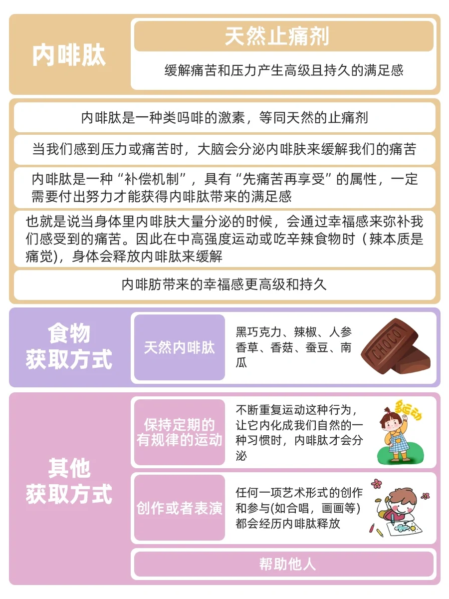 内啡肽是通过体验苦尽甘来的满足感、成就感使你快乐的,它可以舒缓痛苦和压力。