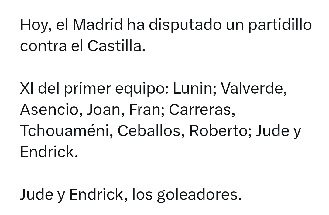 首发:卢宁;巴尔韦德、阿森西奥、霍安·马丁内斯、弗兰;卡雷拉斯、楚阿梅尼、塞瓦略斯、罗伯托;贝林厄姆和恩德里克。