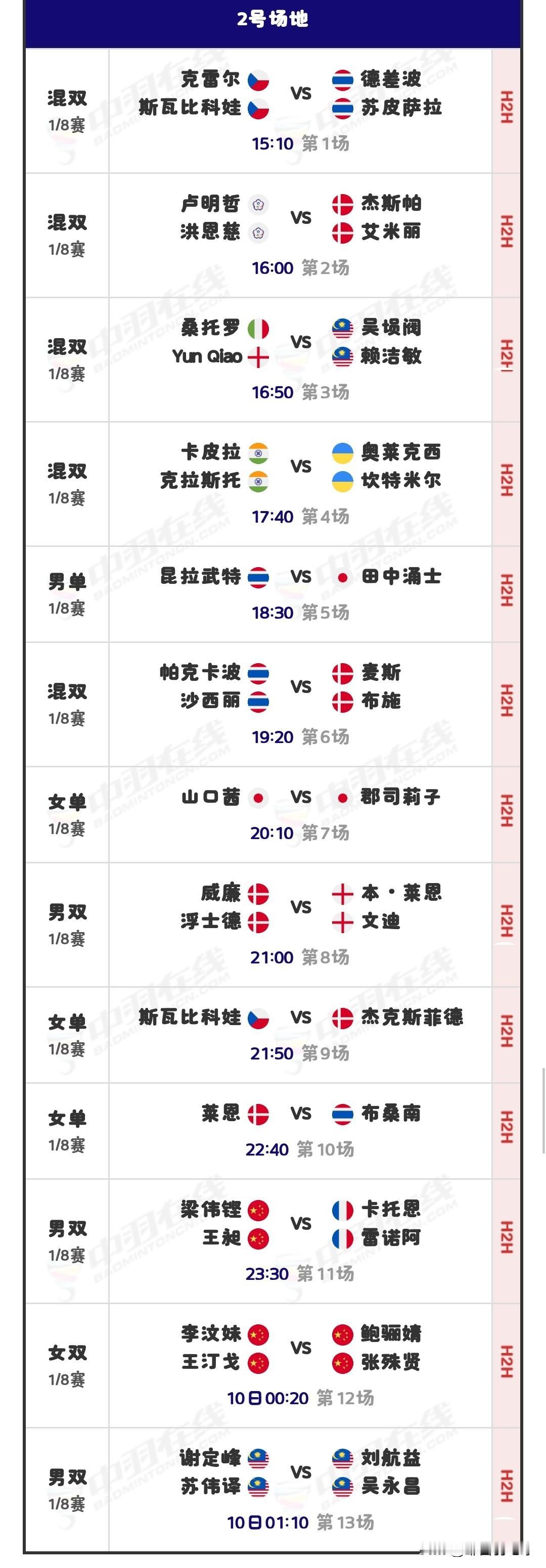 10月9日北极羽毛球公开赛1/8决赛安排 昨日,国羽在比赛中斩获7胜4负的成绩。坑姝良/李华洲连丢两局,败于阿莱西娅/费比拍下;翁泓阳历经三局苦战,不敌郑加恒;黄荻/刘阳激战两局后,负于钟鸿健/海卡尔;王正行直落两局落败于田中涌士,连续四站比赛一轮即遭淘汰。 历经前两天的激烈角逐,首轮比赛已全部结束,国羽共计取得了10胜6负的战绩。(凤凰组合、酱板鸭组合,首轮轮空,直接进入1/8决赛) 今天北京时间15:00开始,进行1/8决赛,共有三块场地同时进行,陆光祖对阵大林拓真,韩千禧对阵米娅,国羽女双内战,凤凰组合、酱板鸭组合登场,详细对阵安排如下: 国羽赛程 国羽挑战 羽毛球 羽毛球爱好者 羽毛球比赛 国羽 国羽加油 陆光祖