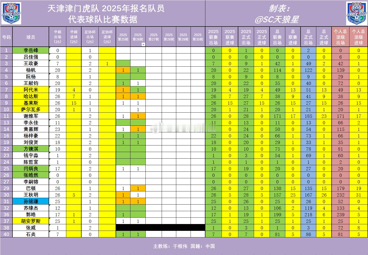 天津津门虎 2025中超 第26轮(1:0河南)赛后数据: