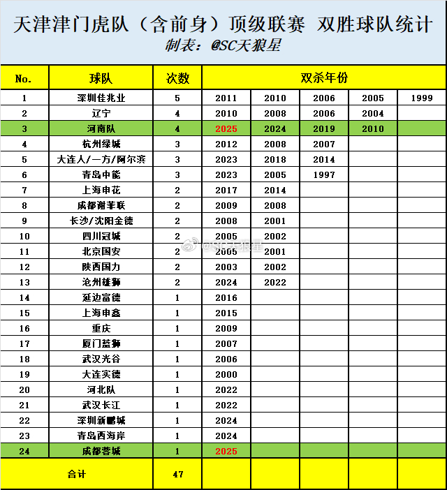4. 河南队成为今年联赛第2支,被津门虎主客场双杀的球队(第1支是成都)。这也是职业化以来,津门虎在顶级联赛中,第4次单赛季双杀河南队。(图4)