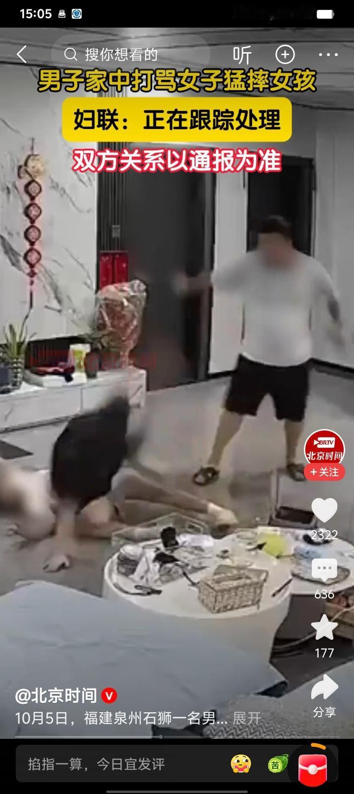 福建一男子在家打骂女子还猛摔孩子,妇联:正在跟踪处理 监控里能看到,一名男子在家中打骂女子,后来还把孩子猛摔出去,那场面特别让人难受。 现在石狮市妇联的工作人员说,已经第一时间去了解情况了,正在跟踪处理这件事;至于双方具体是什么关系,得等官方通报才能确定。 说真的,不管有啥矛盾,动手打人本身就不对,还牵扯到孩子,这真的太过分了。希望妇联和相关部门能把后续处理好,也盼着那位女士和孩子都平平安安的。家暴和伤害孩子的行为,真的不能容忍,咱们也一起等个后续通报吧。 遭遇家暴该如何自救?评论区分享你的法律知识家暴你选择原谅还是离婚 殴打小孩