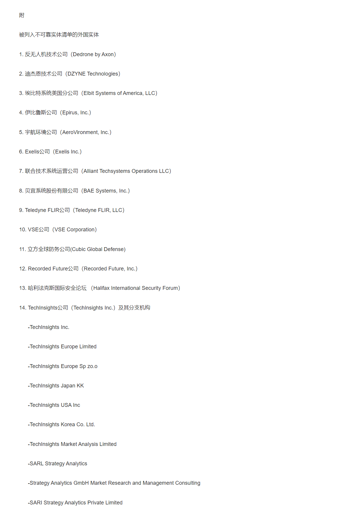 【商务部:将反无人机技术公司等外国实体列入不可靠实体清单】禁止不可靠实体在中国境内新增投资 10月9日消息,据商务部网站,为维护国家主权、安全和发展利益,决定将反无人机技术公司、TechInsights公司及其分支机构等外国实体列入不可靠实体清单,并采取以下处理措施: