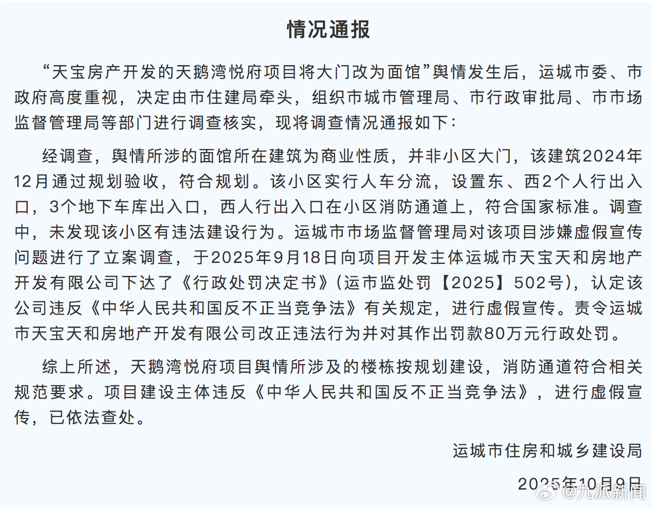 经调查,舆情所涉的面馆所在建筑为商业性质,并非小区大门,该建筑2024年12月通过规划验收,符合规划。该小区实行人车分流,设置东、西2个人行出入口,3个地下车库出入口,西人行出入口在小区消防通道上,符合国家标准。调查中,未发现该小区有违法建设行为。运城市市场监督管理局对该项目涉嫌虚假宣传问题进行了立案调查,于2025年9月18日向项目开发主体运城市天宝天和房地产开发有限公司下达了《行政处罚决定书》(运市监处罚【2025】502号),认定该公司违反《中华人民共和国反不正当竞争法》有关规定,进行虚假宣传。责令运城市天宝天和房地产开发有限公司改正违法行为并对其作出罚款80万元行政处罚。