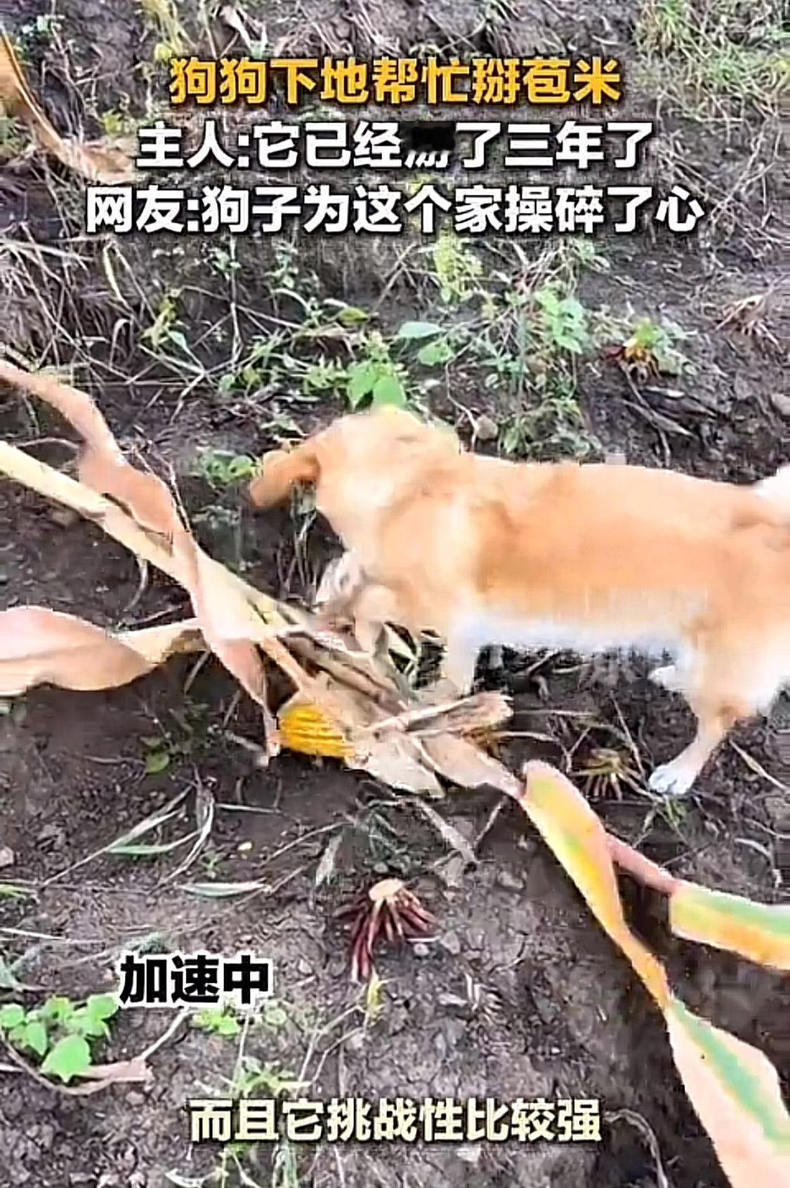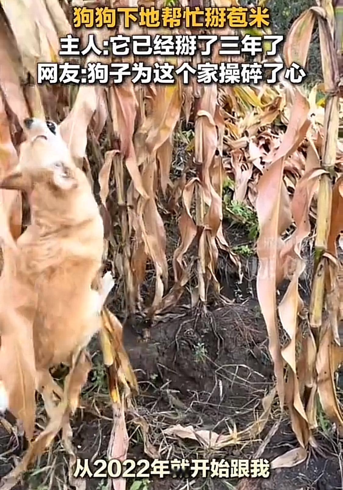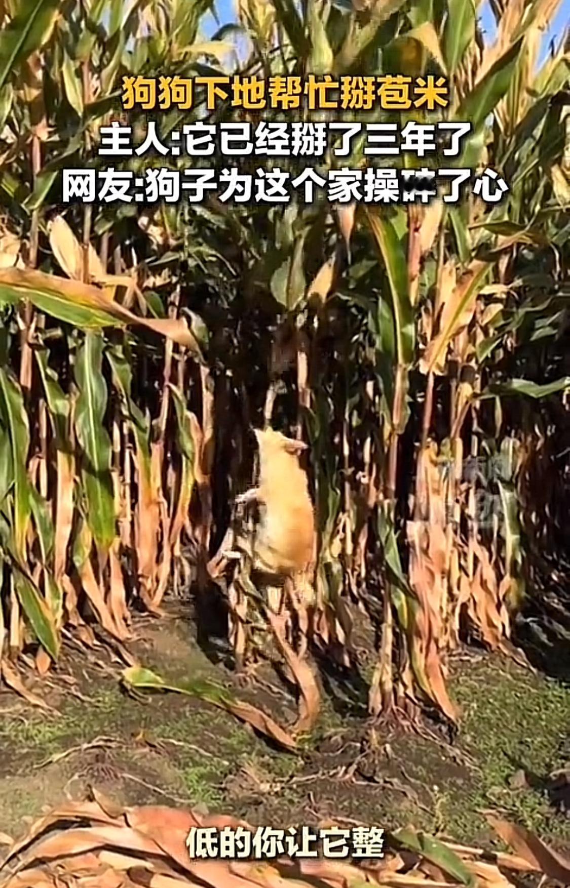 黑龙江这只“玉米界打工狗”太牛了!它从2021年到主人家,2022年起就开始帮忙掰玉米,到现在已经干了3年。主人还没开始,它就自己上了,专挑高杆玉米,动作那叫一个利索,先跃起来咬住苞米杆往下拽,倒地后剥开壳再叼到一旁。 网友都调侃它比家里孩子还懂事,是来报恩的。没谁教它,它看着主人忙活就学会了,这智商和自觉性没谁了。比起那些娇气的宠物,这只狗狗的“打工日常”太暖心,真把自己当家里一份子,陪着主人扛起生活,必须给它加个鸡蛋和火腿! 话说,大家国庆回家收秋了吗?假期结束,你的后备箱装满了吗? 干活的狗 劳模小狗 最牛打工狗 收秋