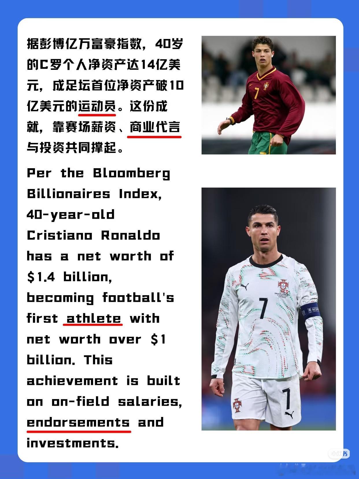 据彭博亿万富豪指数首次评估,葡萄牙球星 C 罗当前净资产已达14亿美元,成为足坛首位身价突破十亿美元的球员。