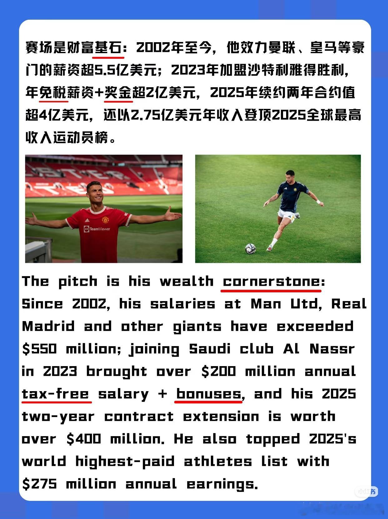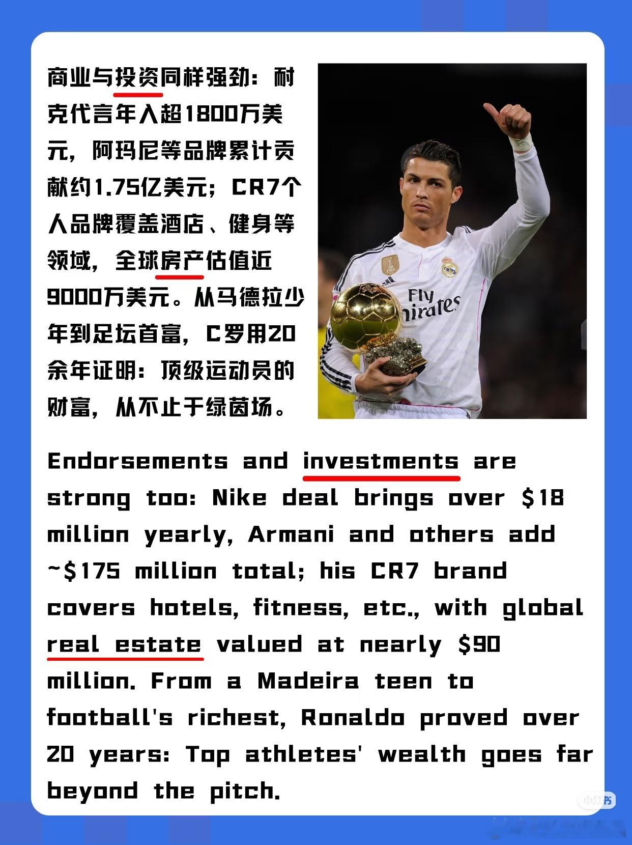 C 罗的收入来源主要包括高额薪水、赞助合同以及个人商业投资。
