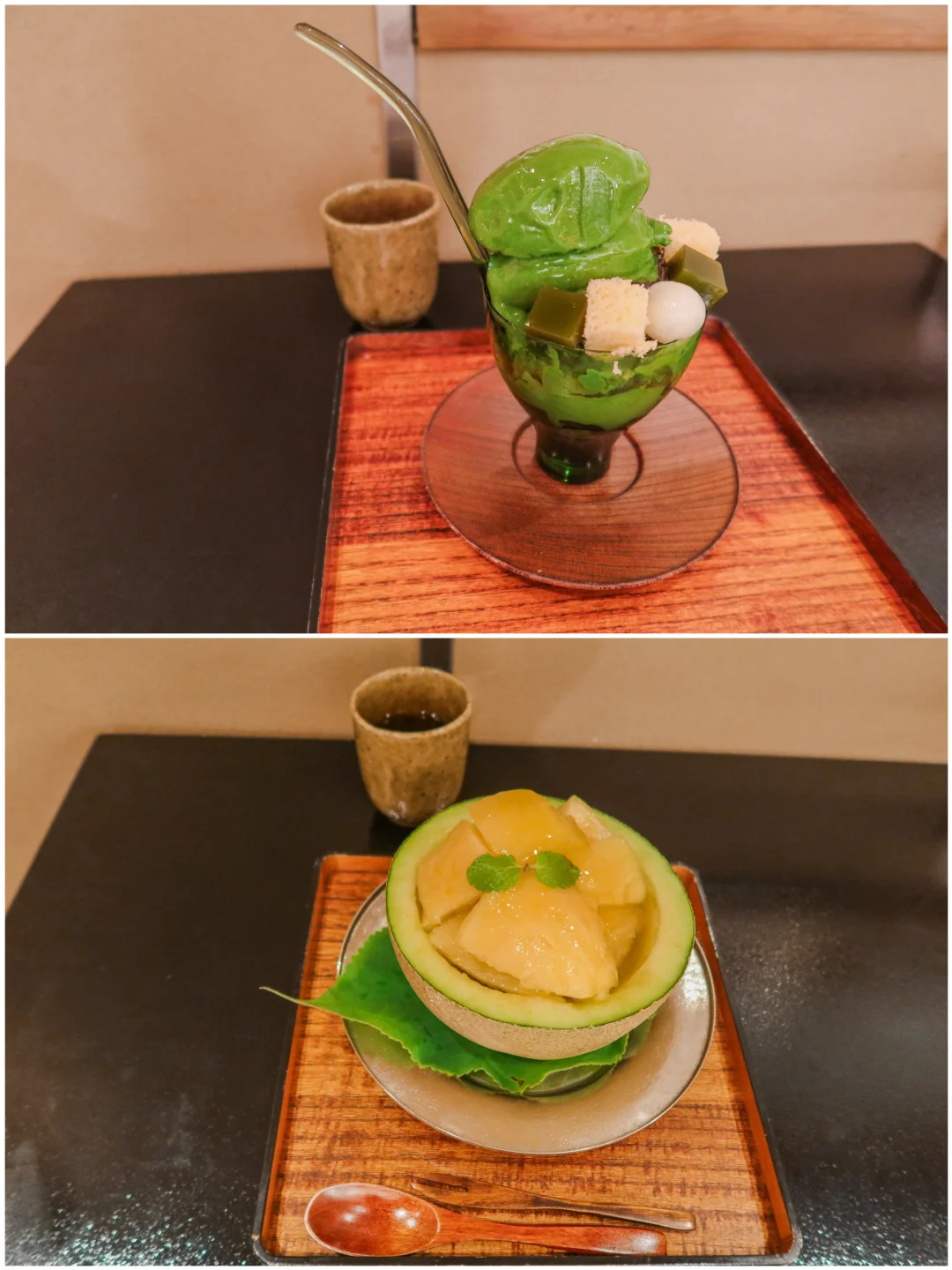季节限定的蜜瓜冰🍈一定要点!挖开顶层的奶油,底下全是鲜甜多汁的蜜瓜块,咬下去满是果香;小朋友心心念念的抹茶巴菲🍨也没让人失望,口感超丰富。