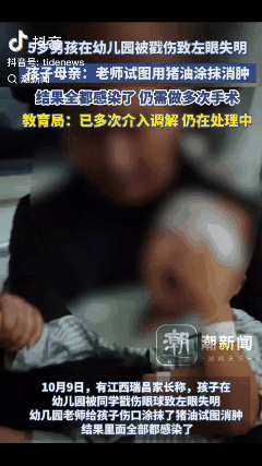 “太可怜了!”江西瑞昌,5岁男孩在幼儿园被同学戳伤眼球致左眼失明,老师在伤口涂猪油试图消肿,结果全都感染了。网友:猪油能消肿? 让人感到奇怪的是老师在发现孩子眼睛受伤后,没有及时联系家长并送医救治,反而给孩子伤口涂上猪油试图消肿,这是在哪学的方法。 男孩在幼儿园被同学戳到眼球,据孩子的妈妈魏女士说:现在整个眼角膜、虹膜、晶体、玻璃球、睫状肌全都破了。园方已向魏女士支付了27万医药费,但孩子后续的医疗费用还是一个难题。而男孩的一生也毁了,从一个正常男人变成了残疾人。男孩在妈妈的怀里哭的撕心裂肺,让人很是心疼。 老师的做法确实让人感到意外,男孩在学校受到伤害后,没有第一时间送往医院,也没有和家长进行沟通。 有网友说:这是一个不负责任的老师,那可是眼睛啊,害了孩子的一生。 其实这个网友说的还是很有道理的,眼睛对我们来说至关重要。虽然以后植入一个人工晶体在外观上看起来差不多,但他却失去了眼睛本有的功能,也让孩子成了残疾人。 这么小的孩子就要承受这么大的痛苦,这是无法用金钱可以弥补的。 对此你有什么看法?欢迎评论区留言。