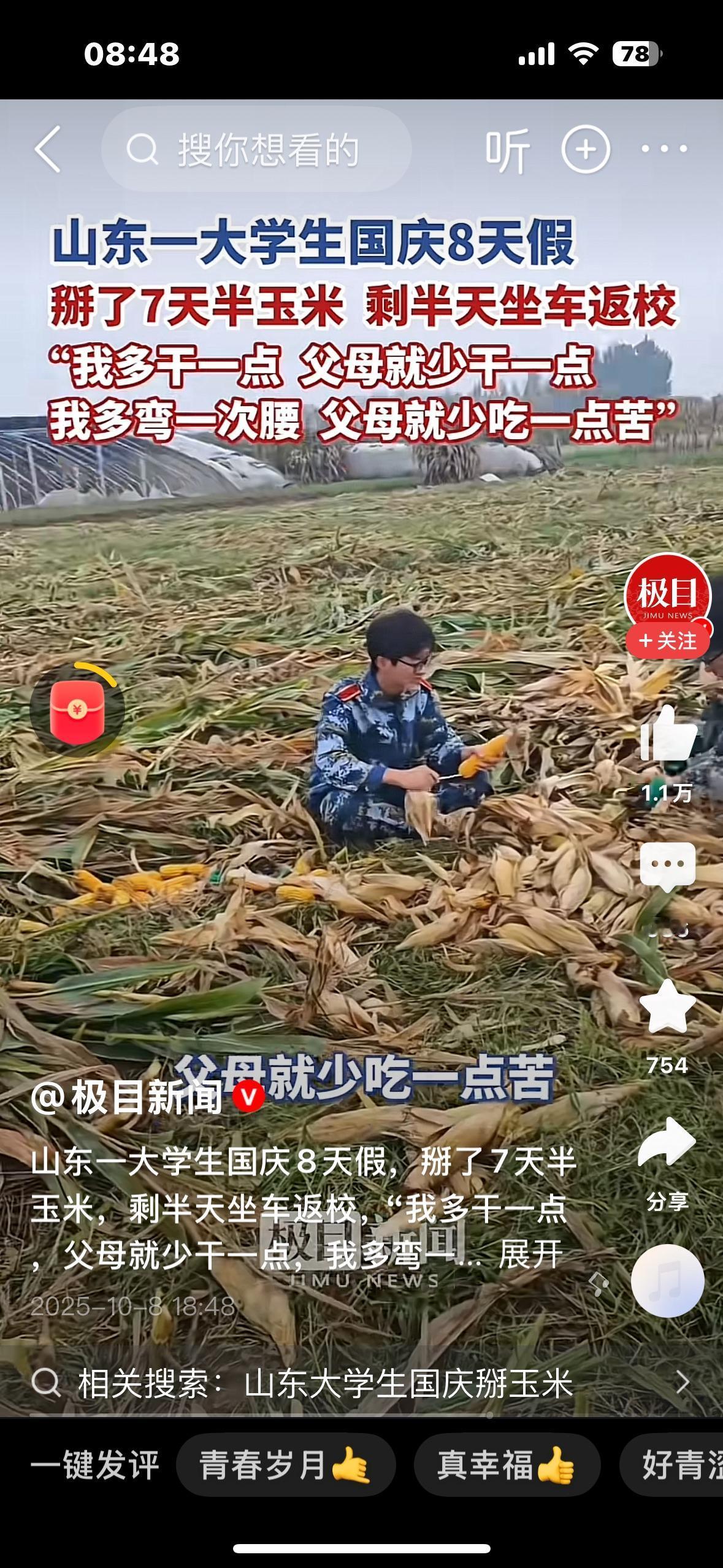 一个值得被全网学习的大学生! 国庆小长假,当大学生们都沉浸在吃喝玩乐中时,山东农业大学的大一新生孟成,却一头扎进了玉米地帮父母收玉米,8天的假期,7天半收玉米,半天时间用来赶车回学校。 这样懂事的大学生,我敢说山东找不出第二个,即使全网也实属罕见。现在大学生,扎玉米地不是他们的风格,耍手机玩游戏才是日常。 孟成父母平常摆摊卖水果,今年国庆,阴雨连绵不断,使机械根本无法进入,再不抢收就要烂在地里。他们是看在眼里急在心里。 孟成的父母还有一个水果摊,国庆也是生意最好都时候,那一头都不舍得,孟成看出了父母的担忧,他连忙安慰道:不用担心,玉米我来收! 于是,他一头扎进玉米地,先在地里手掰玉米,再把玉米从地里运到家里,手让玉米叶片拉出一道道血口子,他贴个创可贴继续干,用他的话说,我的根就在农村,自己多弯腰一次,父母就少吃一些苦。 反观那些饭来张口衣来伸手的大学生,孟成这样的孩子就显得弥足珍贵。成绩好与坏对他来说已经不重要,就务实和孝道这一块就足以打败全网99%的孩子,这才当今最该有的教育!