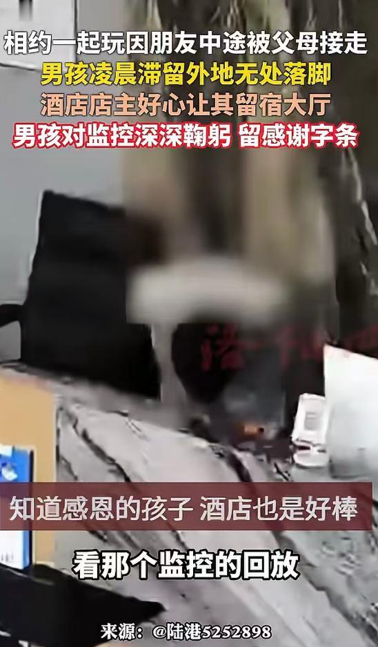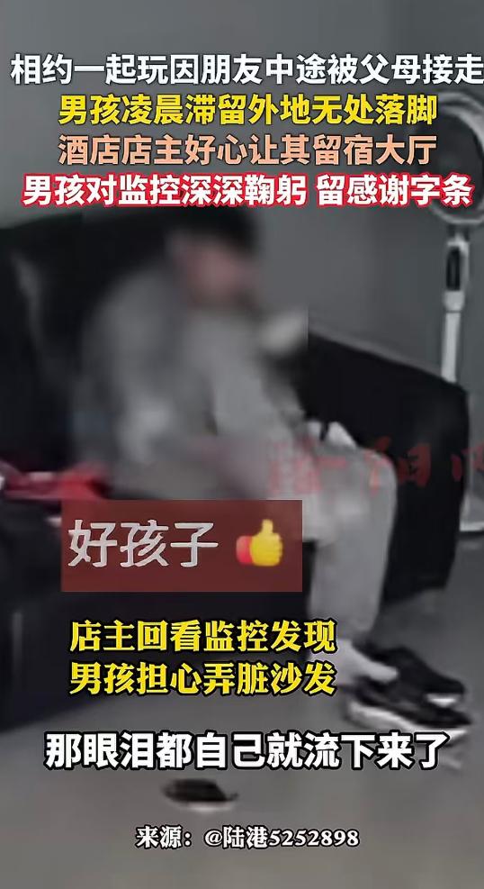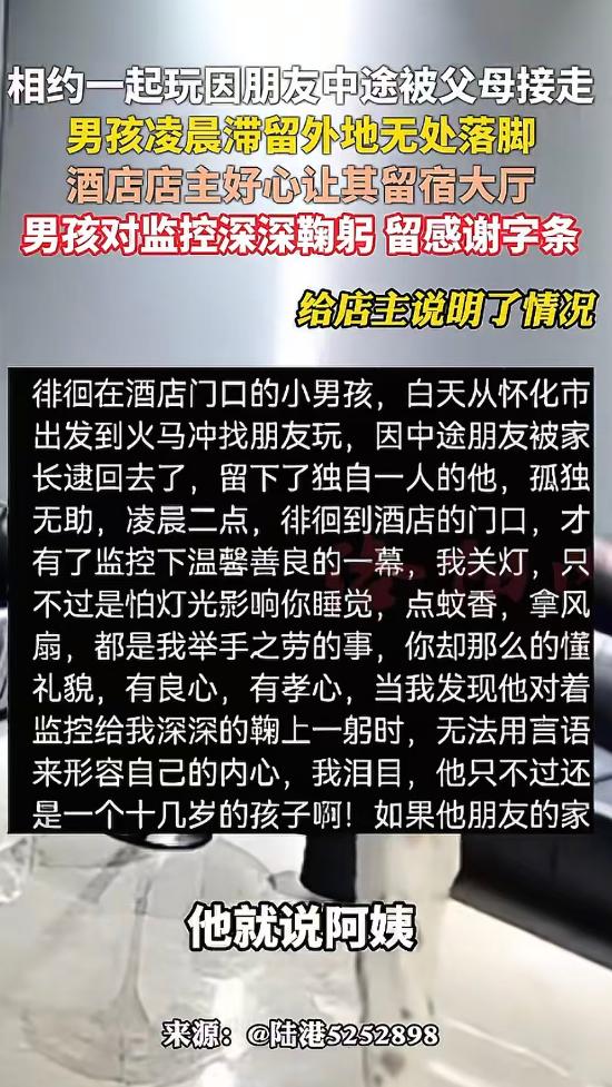 近日,湖南怀化,酒店老板正在前台看店,发现有个十几岁的小男孩一直在酒店门口徘徊,老板就让他进来休息,没想到的是,第二天男孩走之前的一个动作,让老板感动落泪。 凌晨两点,酒店老板在前台无聊的玩着手机,准备在过一会儿没有客人来就关门睡觉了,这时老板发现门外有个男孩一直在酒店门口徘徊,好像在做什么重要的决定。 过了没一会儿,男孩下定决心般走进酒店,小声问老板能不能让他在大厅里面睡一觉,自己身上实在拿不出钱来了,一边说着,男孩一边伤心的抹着眼泪。 男孩说,自己是从外地过来找朋友玩的,玩的过程中自己身上带的钱都花完了,本来跟朋友商量的晚上一起住,没想到中途朋友被父母接走了,现在联系不上了,而自己身上也没有钱,实在没地方去了,只能求老板给自己一个睡觉的地方,明天再跟朋友联系。 老板看男孩的经历实在是可怜,二话没说就答应了男孩的请求,让男孩在大厅中过了一夜,老板担心男孩睡不好,把大厅的灯都关了,还贴心的给男孩拿来了蚊香跟风扇,让男孩能睡个好觉。 等到第二天老板起床的时候,发现男孩已经走了,吧台上留下了一张字条,字条上写着谢谢姐姐收留我,男孩害怕风把纸条吹跑,还细心的用两个零食把纸条压的死死的, 老板调昨晚的监控时才发现,男孩为了不弄脏大厅的沙发,特意换了一双干净的新袜子,走的时候还深深的冲着监控的鞠躬, 老板说看到看到男孩的举动,自己也泪目了,没想到一个十几岁的孩子居然能这么细心,这么懂得感恩,如果男孩的朋友也在他身边陪着他,那该有多好。 老板的善举,真是暖到人心里去了,她没把男孩当累赘,反而看到了她的紧迫,给了男孩一个容身之所,帮助男孩度过了人生中最难的一个夜晚,这不仅仅是收留他过夜那么简单,更是用自己的光亮,照亮了男孩未来的人生啊。 男孩的行为也让人感动,没有因为一时的艰难而有什么坏心思,反而用自己的善行,温暖了老板和网友们,这份知恩图报的良心,比啥都金贵。 事情虽小,但是看着让人的心里是这么的温暖,老板和男孩两个人就是善良的双向奔赴,你帮我,我帮你,哪怕日子过的再困呐,也总有向前走的勇气。 最后还是要说一下男孩的朋友和家长,办事太不地道了,别人从外地过来找孩子玩,不说表示一下,也不能中途把孩子带走,让别人流落街头啊, 这事也给我们提了一个醒,交朋友是好的,但也要看交的是什么朋友,如果朋友是个小气的人,但也要尽快远离,因为你不知道什么时候就坑了你。