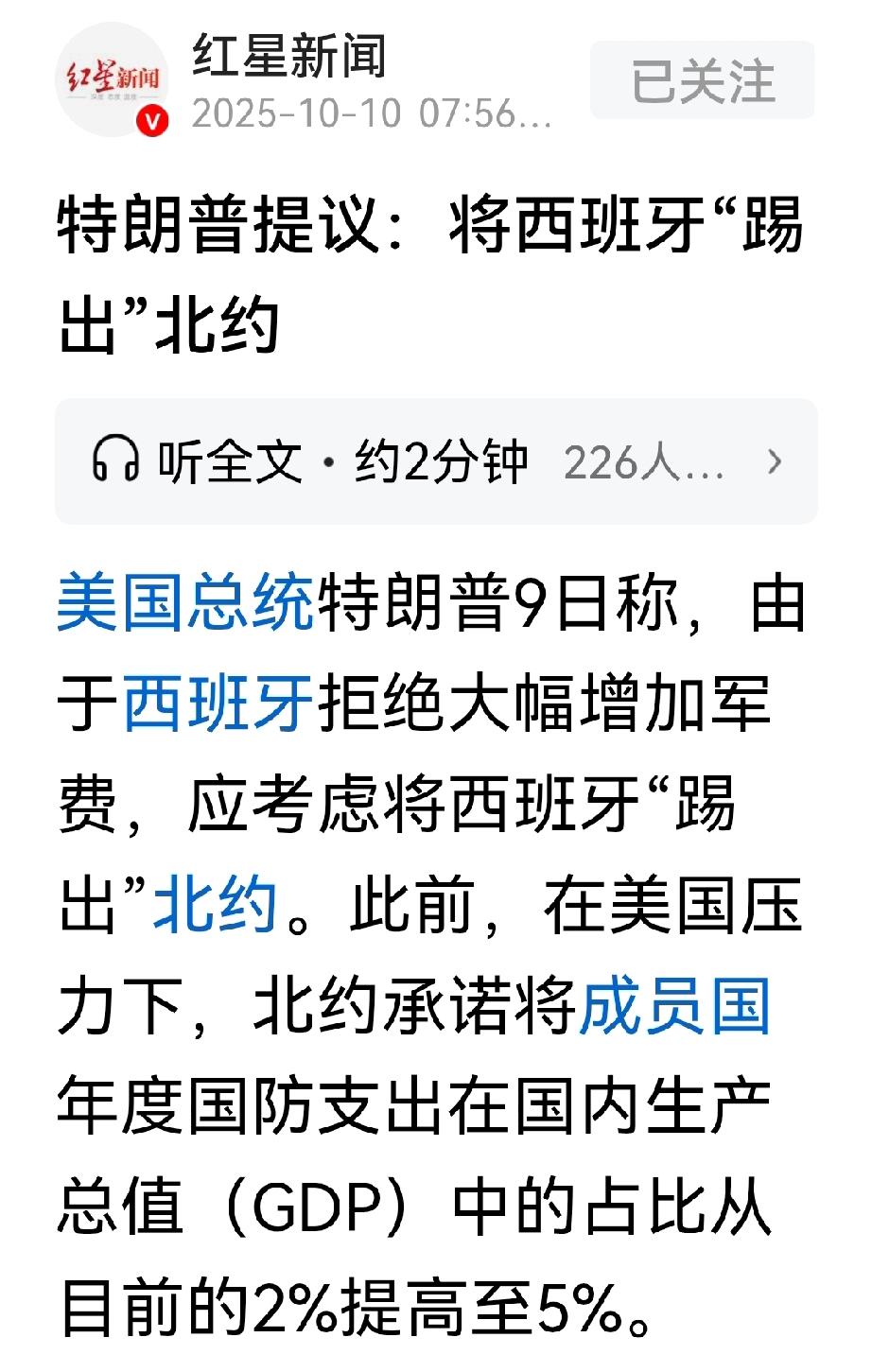 特朗普在白宫会见芬兰总统时说把“西班牙”从北约的队伍中踢出去,原因是西班牙在提高防务费用时反应迟钝,没有将美国建议的把防务费用提高到本国GDP的5%,西班牙仍保持防务费用在以前的2.1%的水平。而且西班牙冻结了原计划购买美国F-35五代机的计划,让美国减少了一笔军购订单。 突然发觉北约组织的价值之一、就是为了美国武器装备销售市场的意义而存在,美国不断扩大北约成员国就是在不断扩大美国武器的销售市场,美国要求北约国家不断提高防务开支,就是为了提高美国武器装备的销售总量。 从地理位置上看,欧洲北约国家与美国相距甚远,北约国家的存在与美国的地缘政治无关,反倒是北约组织的存在威胁到了附近的邻国,引起了邻国间的紧张关系,甚至是有理由相信,有部分国家入约并不是为了要应对向俄罗斯这样的国家,他们加入北约是为了应对北约国家,因为别人都加入了,自己没有加入,惧怕受到北约攻击而不得不入了他们的组织,看看塞尔维亚,没有加入北约,北约就攻击他。 这样一来突然也理解了当初俄罗斯也要加入北约的原因,因为俄罗斯也怕遭到北约的攻击呀。但是美国肯定是不允许,如俄罗斯加入了北约,美国在欧洲地区再也造不出第二个具有威慑力的敌对势力,美国精心打造的北约武器市场就要泡汤,这不符合美国的利益。