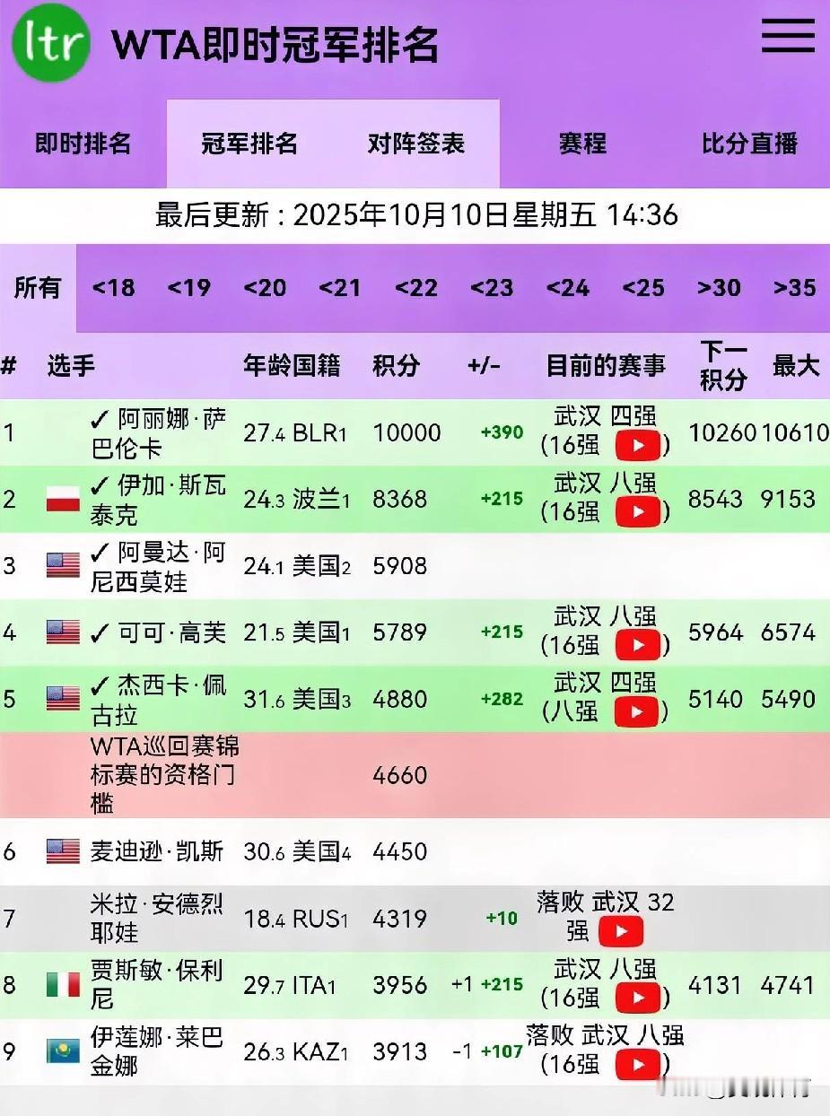 佩古拉晋级武网半决赛后,获得第六张WTA年终总决赛门票 在佩古拉晋级武汉网球公开赛女子单打四强之后,佩古拉的即时冠军排名上升至4880分,成为继萨巴伦卡、斯瓦泰克、高芙、凯斯、阿尼西莫娃之后,第六位获得WTA年终总决赛门票的球员。总决赛的另外两张门票将有米拉•安德烈耶娃、保里尼、莱巴金娜三位球员争夺 ,米拉•安德烈耶娃和保里尼可能性更大。