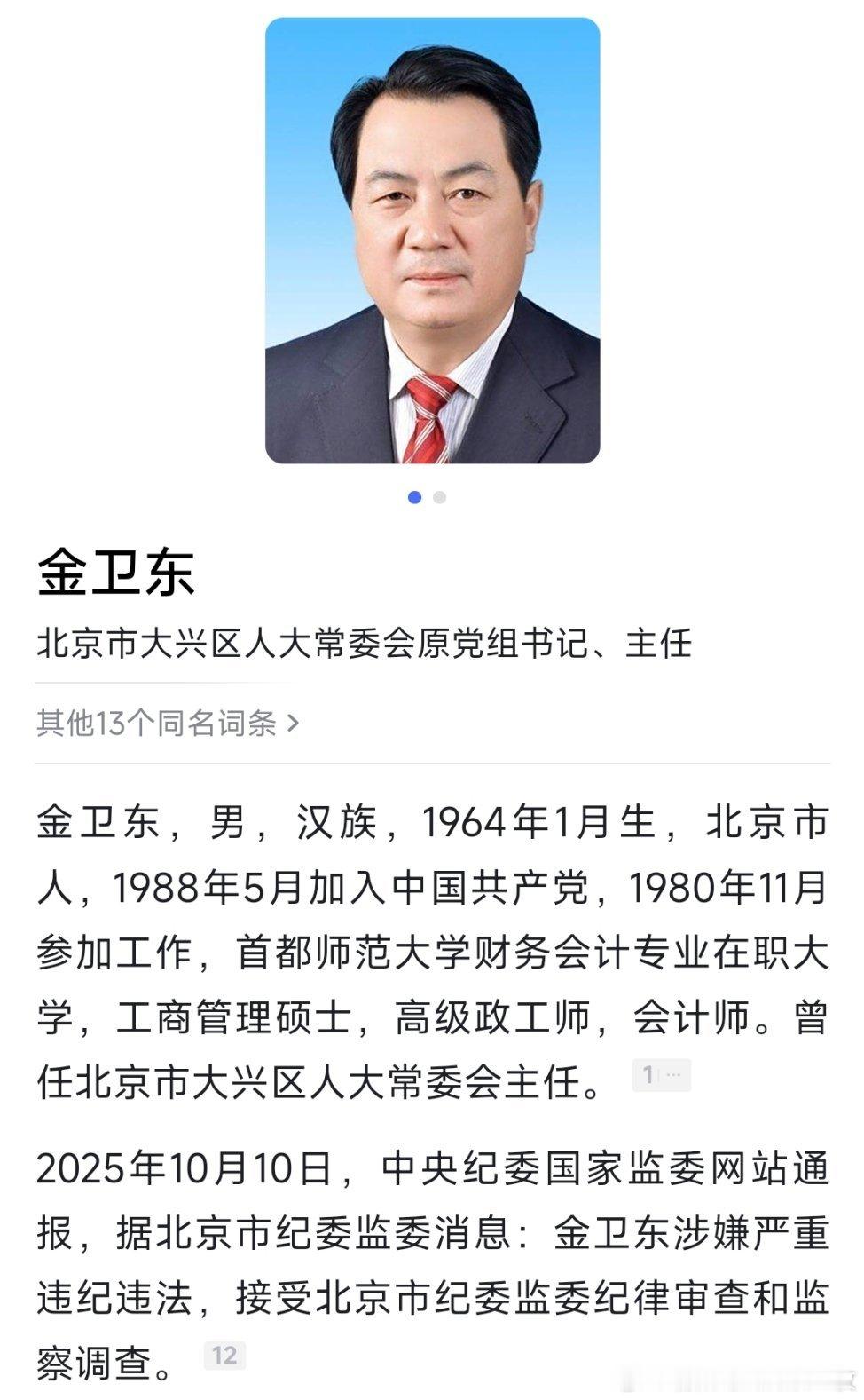 据北京市纪委监委10月10日消息:北京市大兴区人大常委会原党组书记、主任金卫东涉嫌严重违纪违法,目前正接受北京市纪委监委纪律审查和监察调查。热点现场
