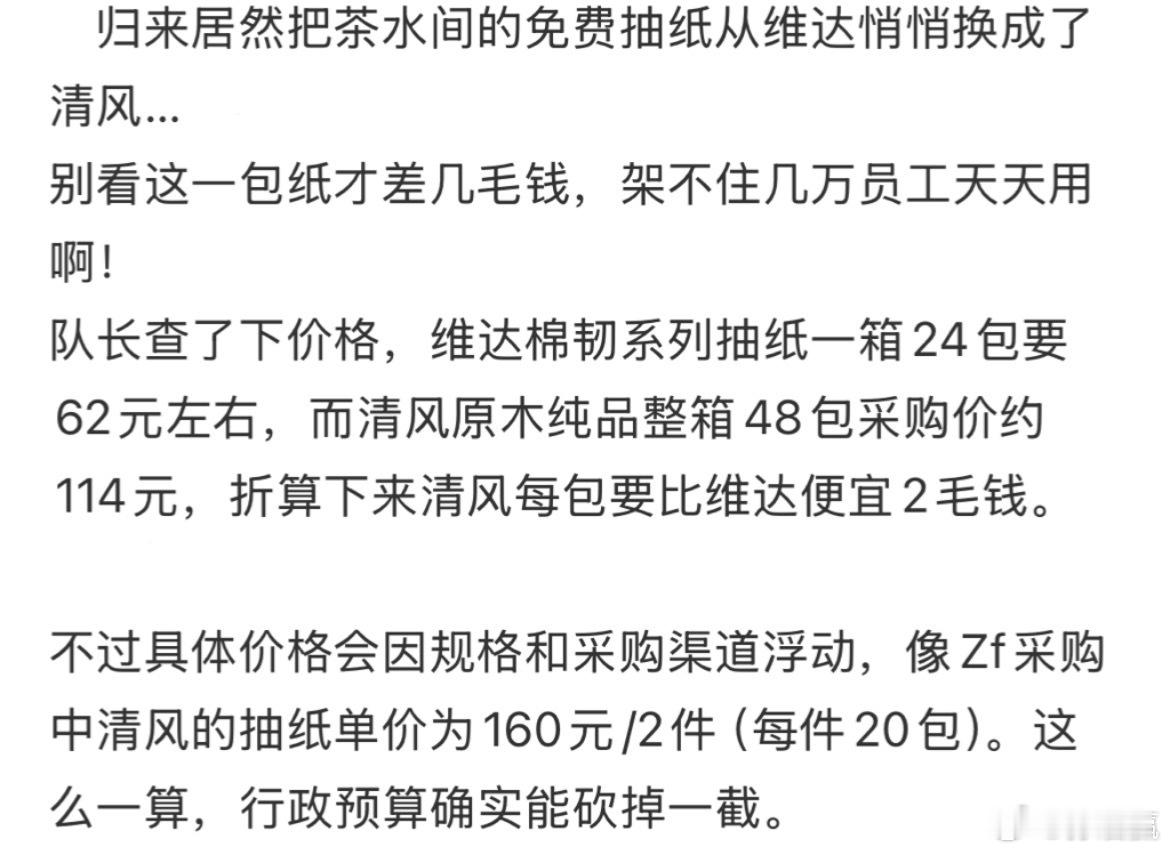 腾讯换了员工抽纸,从维达换成了清风,每包预计省两毛。,每年了节省100多万。