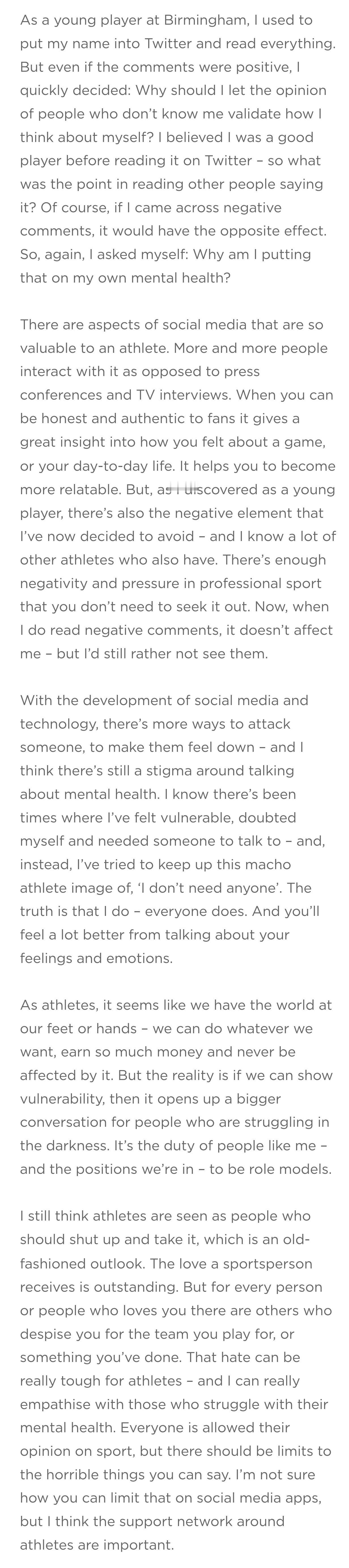 当我还是伯明翰的一名年轻球员时,我常常会在推特上搜索自己的名字,把所有评论都看一遍。但很快我就意识到,即使那些评论是积极的,我也不该让一个不认识我的人来决定我该怎么看自己。在推特上看到别人称赞我之前,我就已经相信自己是一名好球员,那我又何必去看别人怎么说呢?当然,如果我碰到负面评论,效果就完全相反。于是我又问自己:为什么要把这样的负担强加到自己的心理健康上?