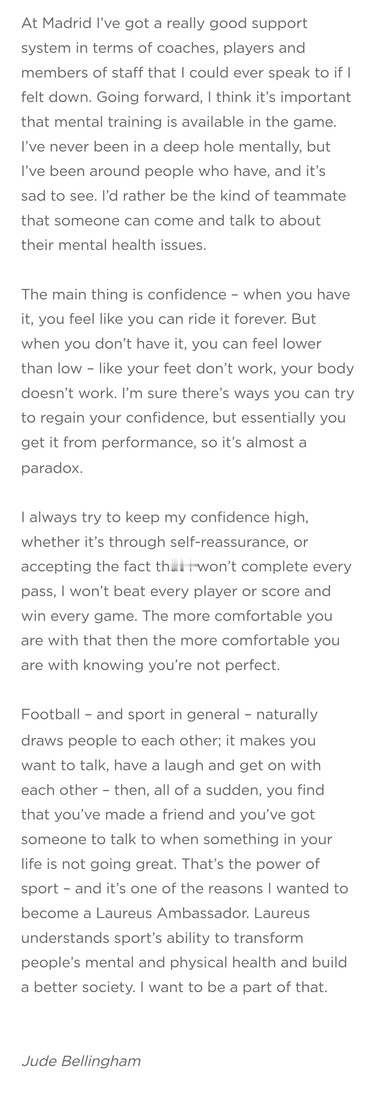 足球——或者说体育本身——天生就能把人们联系在一起。它会让你想去交流、去欢笑、去相处,然后某个时刻你会发现,你结交了一个朋友,当生活不如意时,你有了一个可以倾诉的人。这就是体育的力量——也是我想成为劳伦斯大使的原因之一。劳伦斯深知体育在改善人们心理与身体健康、建设更美好社会方面的力量。我希望能成为其中的一部分。