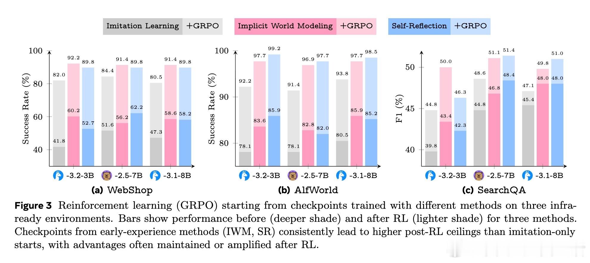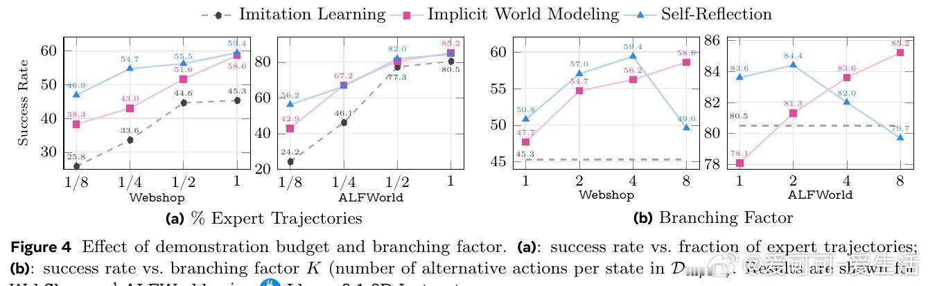 3️⃣ 多环境多模型实证:涵盖8种不同任务(网页导航、多轮工具调用、科学实验、长程规划等),显著提升成功率+9.6%,强化泛化能力,且为后续强化学习提供强劲预训练基础。