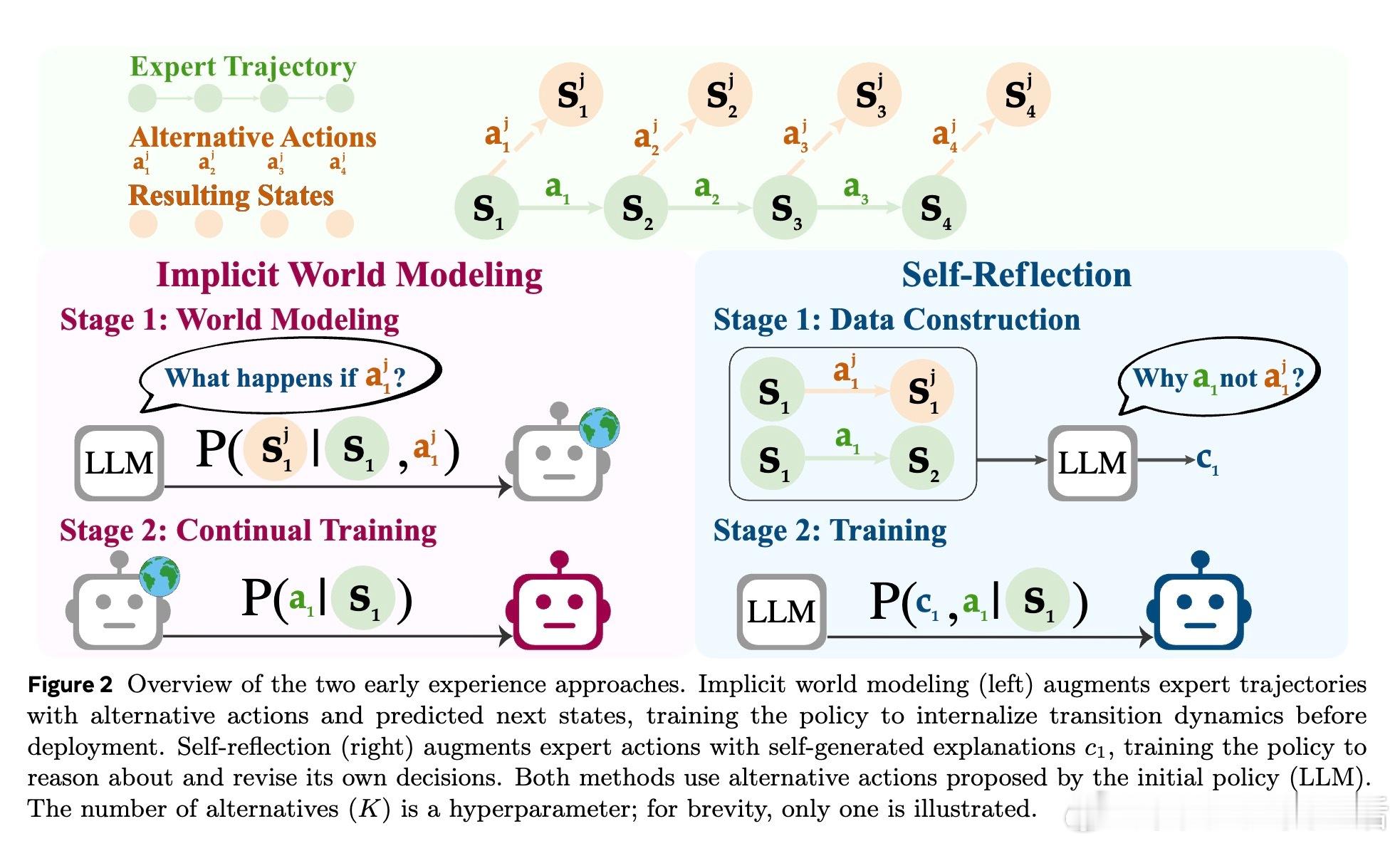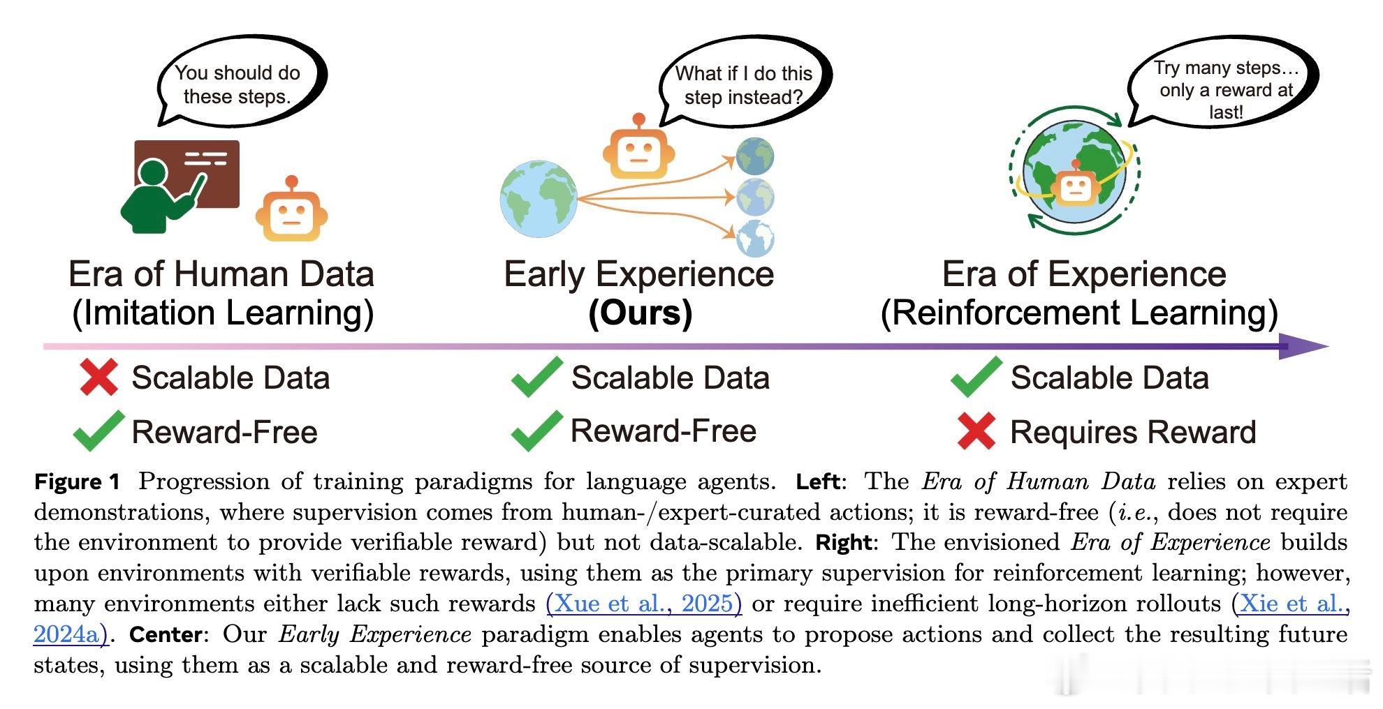 1️⃣ 早期经验范式:智能体主动执行多样化操作,收集由自身行为产生的未来状态作为无奖励的监督信号,实现从自身“经验”中学习。