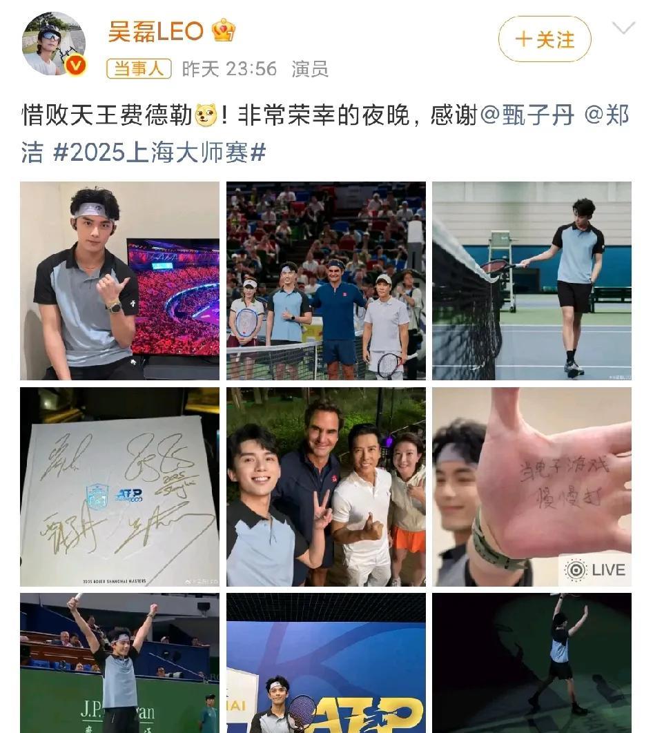 吴磊惜败费德勒,虽败犹荣! 吴磊这个跨界表演堪称完美,在电视剧《爱情而已》里,他是职业网球选手。在上海与自己的偶像打了表演赛,圆梦之后非常兴奋! 费德勒开始打职业联赛时,吴磊还未出生,两人相差18岁。吴磊25岁,费天王职业生涯24年!两人的同场竞技说明了上海大师赛影响力确实越来越大了!