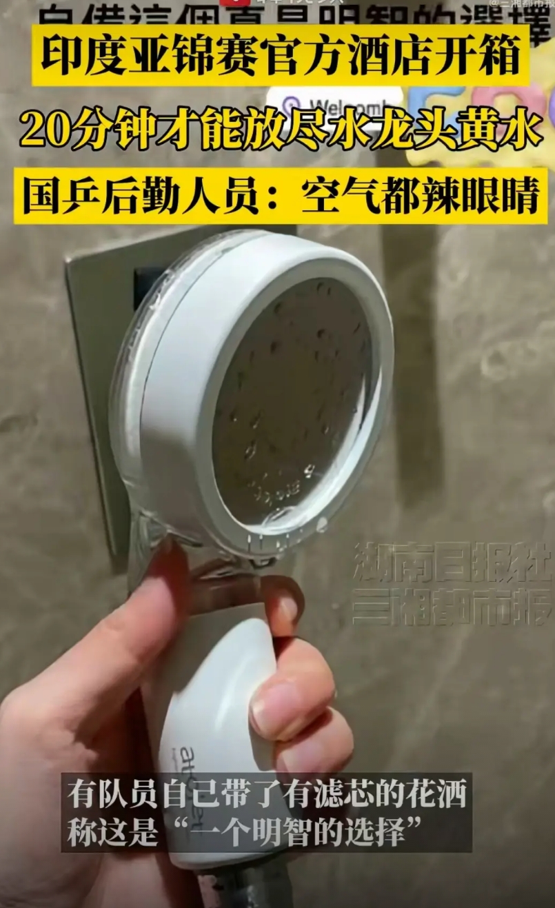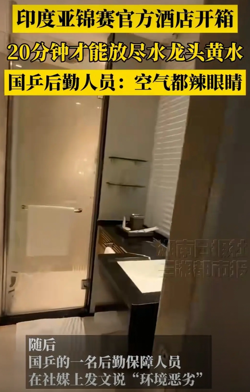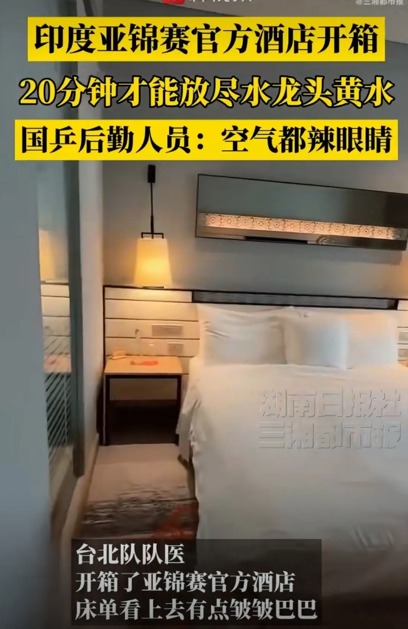 10月9日国乒到达印度环境恶劣,连空气都辣眼睛,真的下飞机都戴上口罩了。有后勤人员说这20多分钟放不完的黄水。真的孙颖莎特别爱干净,我真怕她白色衣服都没法洗,王曼昱属于体质不太好的一定要注意饮食。王楚钦也很爱干净,这皱巴巴的床,加上黄色的水没办法想象,印度是怎么拿到亚锦赛申办权的,真的替运动员担心身体状态。