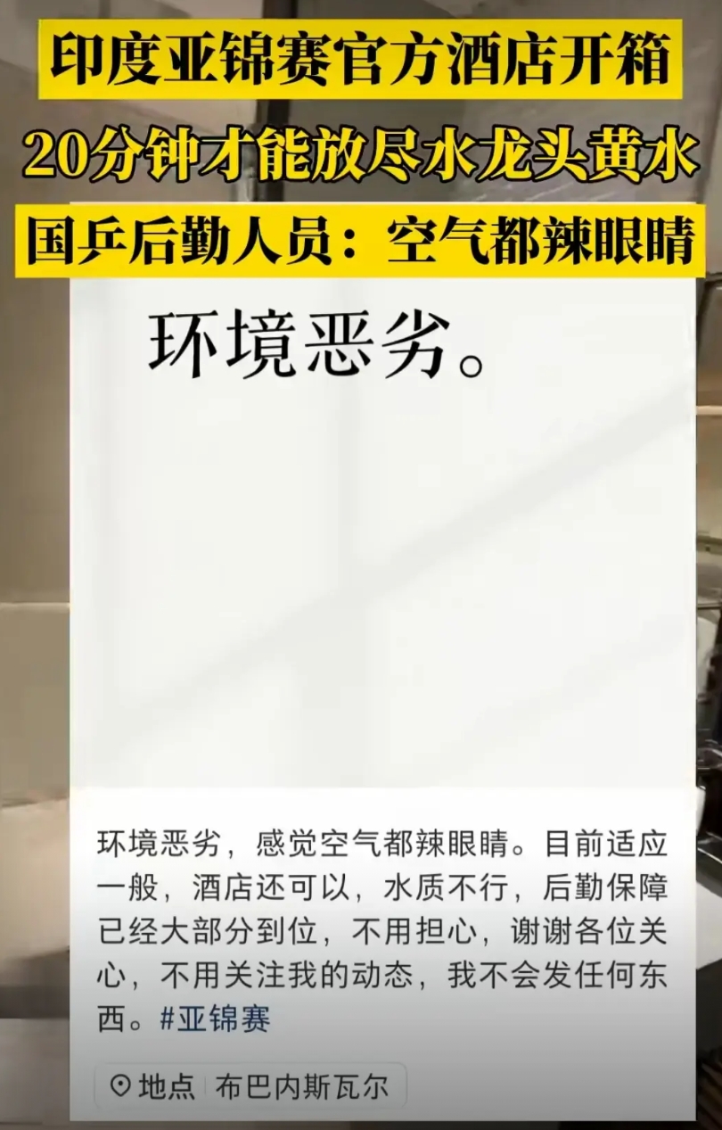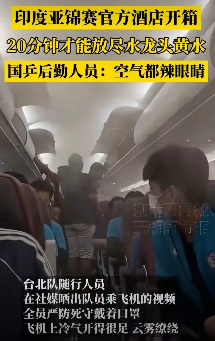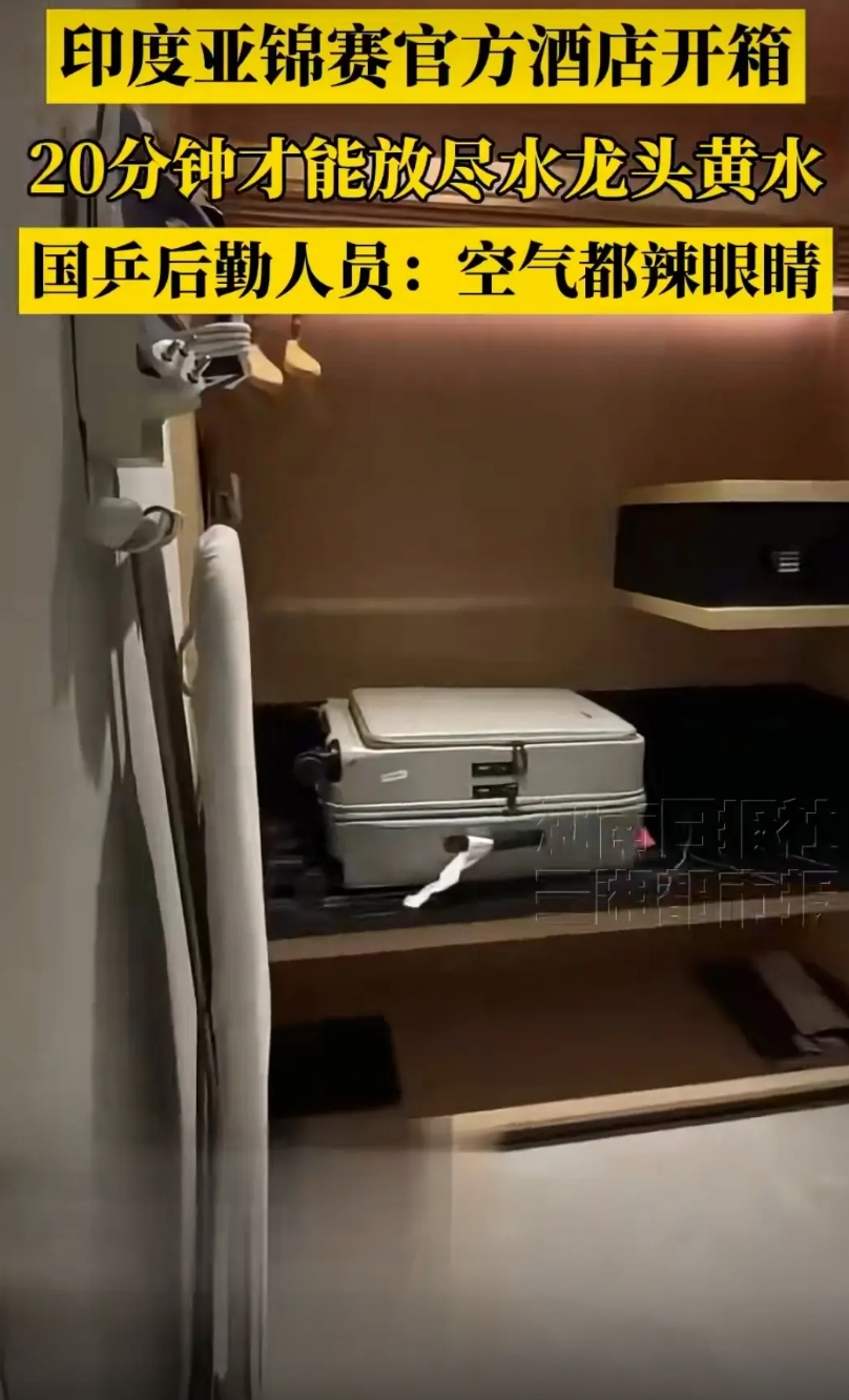 10月9日国乒到达印度环境恶劣,连空气都辣眼睛,真的下飞机都戴上口罩了。有后勤人员说这20多分钟放不完的黄水。真的孙颖莎特别爱干净,我真怕她白色衣服都没法洗,王曼昱属于体质不太好的一定要注意饮食。王楚钦也很爱干净,这皱巴巴的床,加上黄色的水没办法想象,印度是怎么拿到亚锦赛申办权的,真的替运动员担心身体状态。