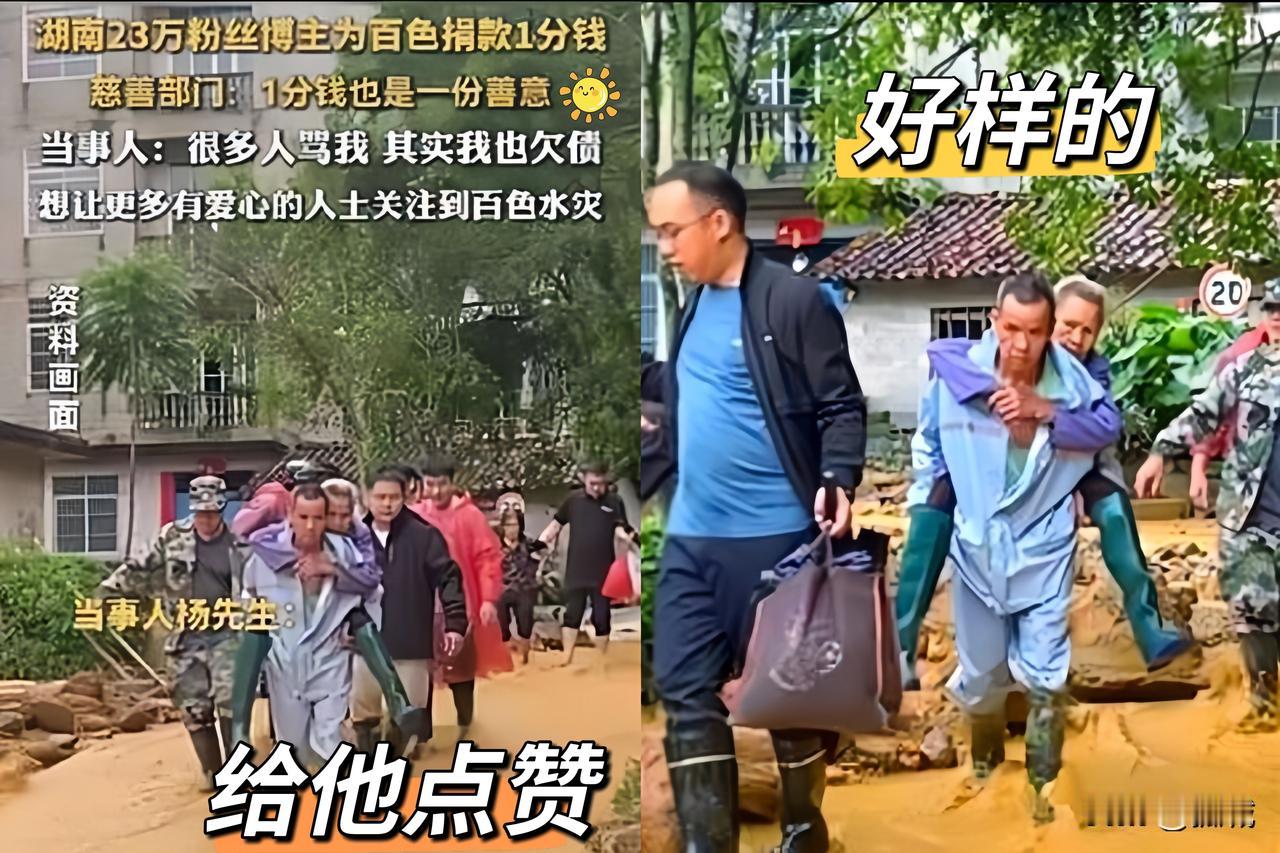 你听说过捐一分钱也能上热搜吗? 湖南一位拥有23万粉丝的博主杨守田, 最近因为向广西百色灾区捐款一分钱,意外陷入了舆论漩涡。这张显示0.01元的电子捐赠证书像一颗石子投入平静湖面,激起千层浪。网友们一边倒地骂他“作秀”、“蹭热度”,他却回应说,这一分钱是个引子,是想让更多人关注广西灾情。果然,这一分钱的效果远超十万捐款——它成功吸引了全网的视线,让百色水灾登上了热搜榜。有人骂他博流量,也有人为他辩护:不管方式如何,他确实让更多人知道了广西的灾情。这个勇敢“以身入局”的博主,独自承受着网络暴力,却让一个几乎被忽视的灾情获得了前所未有的关注。就连慈善部门也站出来表态:一分钱也是一份善意。比起那些天天炒作“鸡排哥”之类网红的社会新闻,这种实实在在引起人们对灾区关注的举动,或许更有价值。毕竟,在爱心的天平上,重要的从来不是数字的大小,而是心意的真伪。 读完这个故事,你有什么想法?如果是你,会选择用这种特别的方式来引起大家对灾区的关注吗?欢迎在评论区分享你的看法!