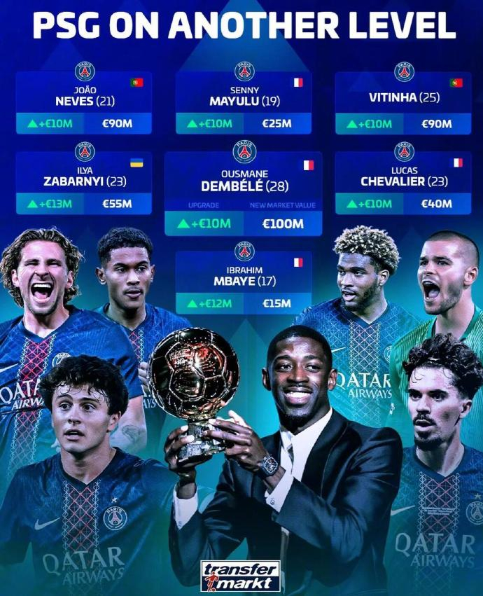 德国转会市场近期更新了法甲球员的身价,巴黎圣日耳曼队内有多名球员身价上涨: