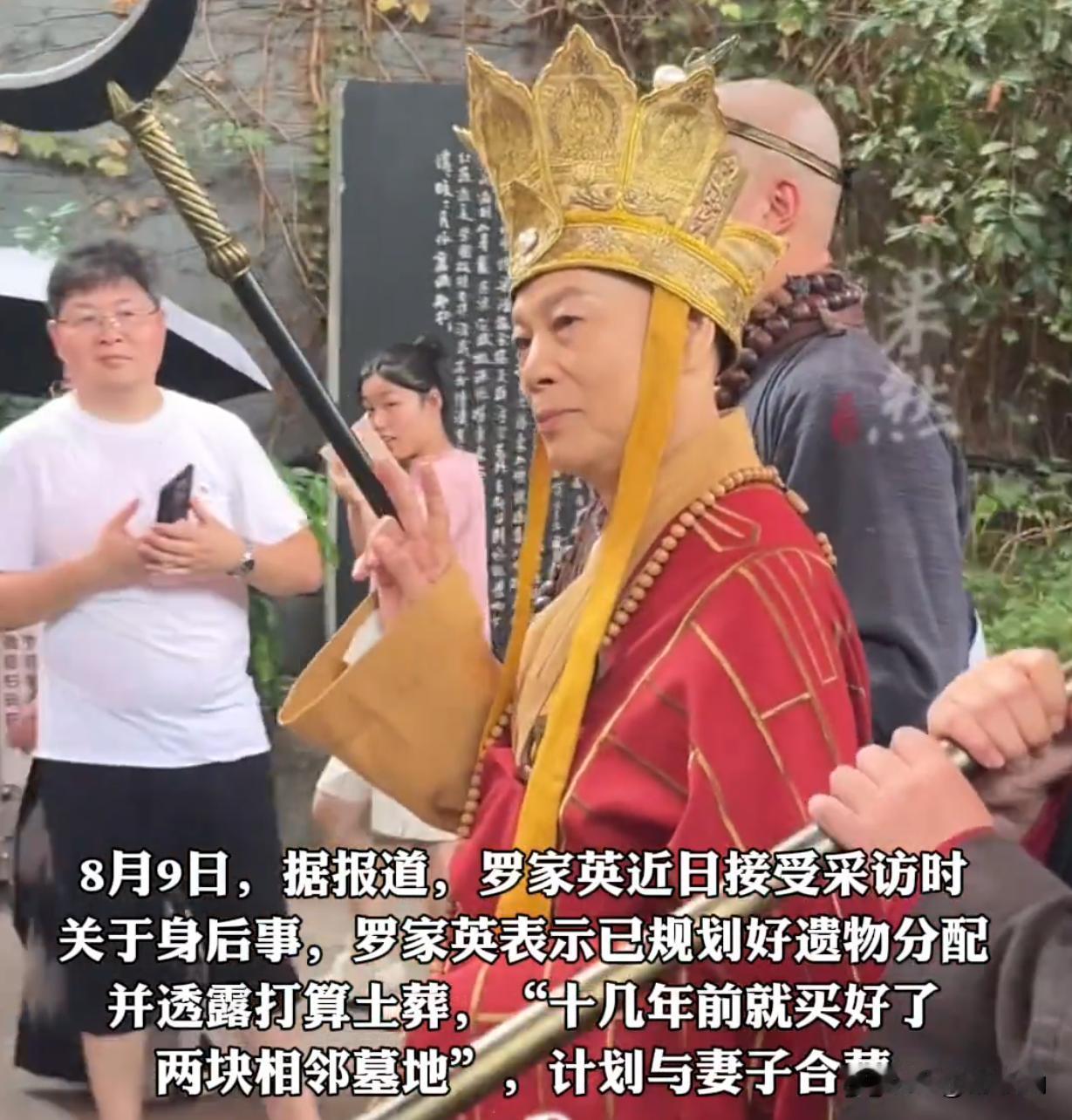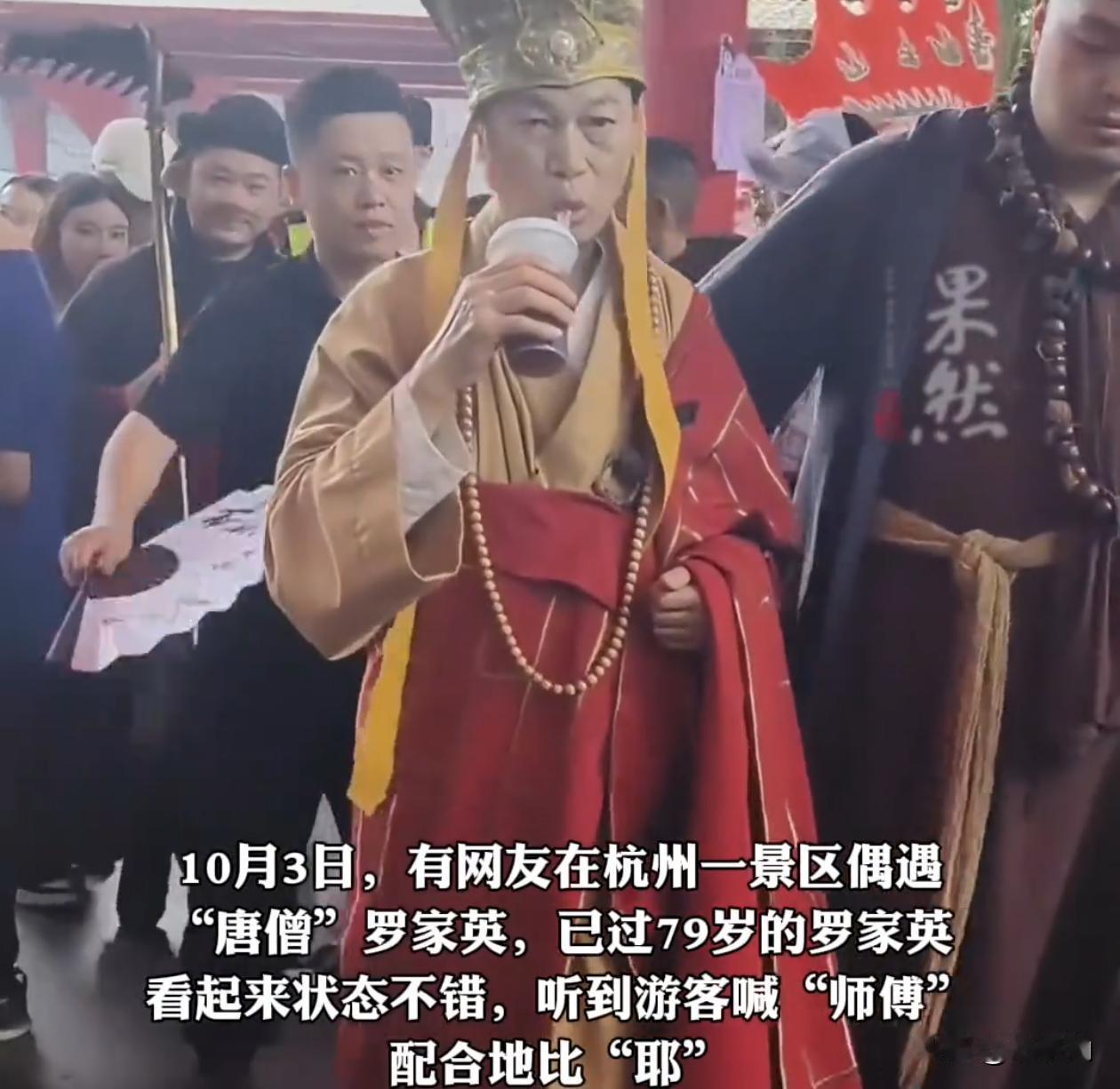 十一假期里,79岁的罗家英在杭州宋城景区打工,扮唐僧和游客互动,状态看上去很好,