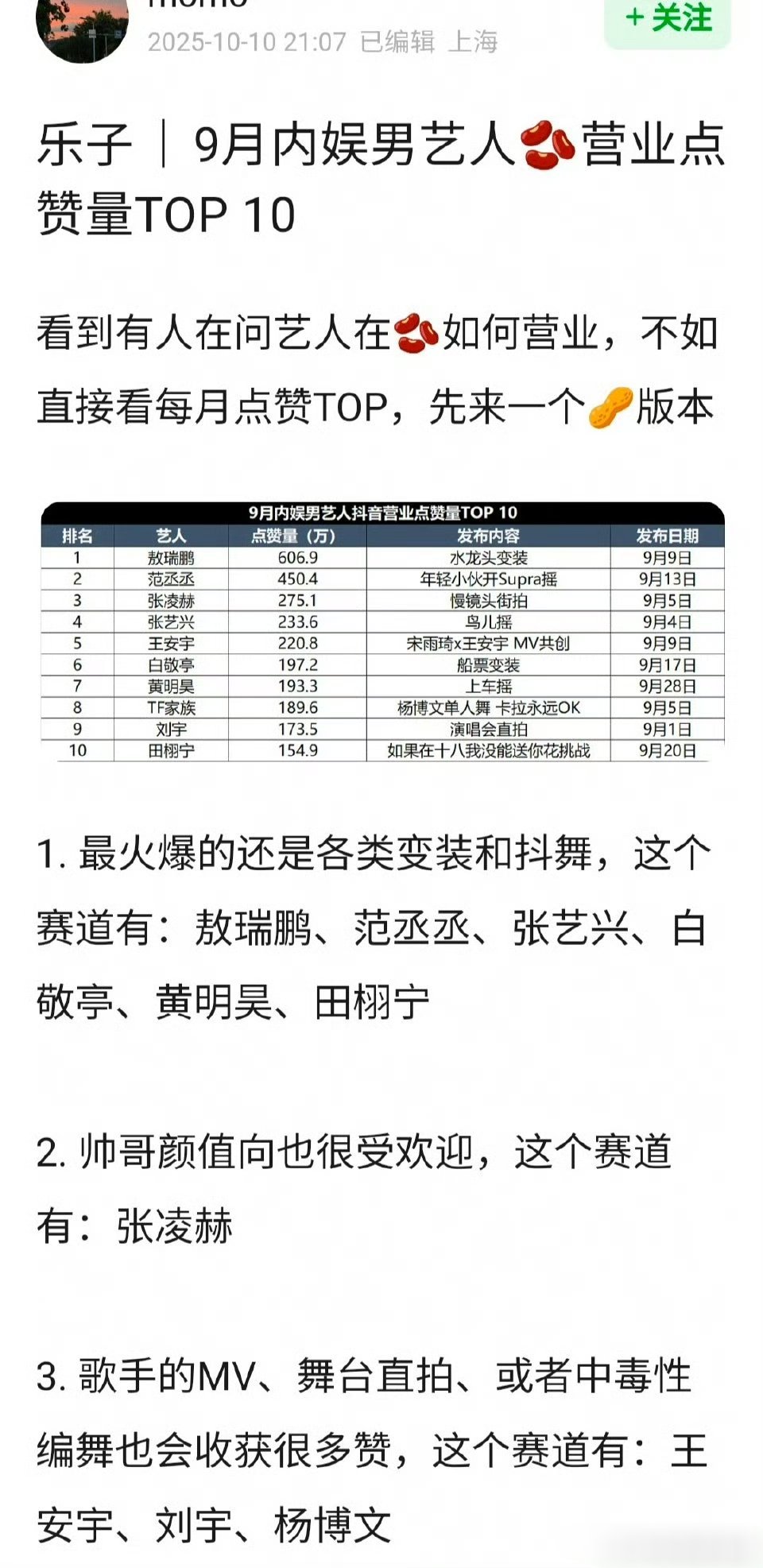 9月内娱男艺人抖🎶营业点赞量TOP 10