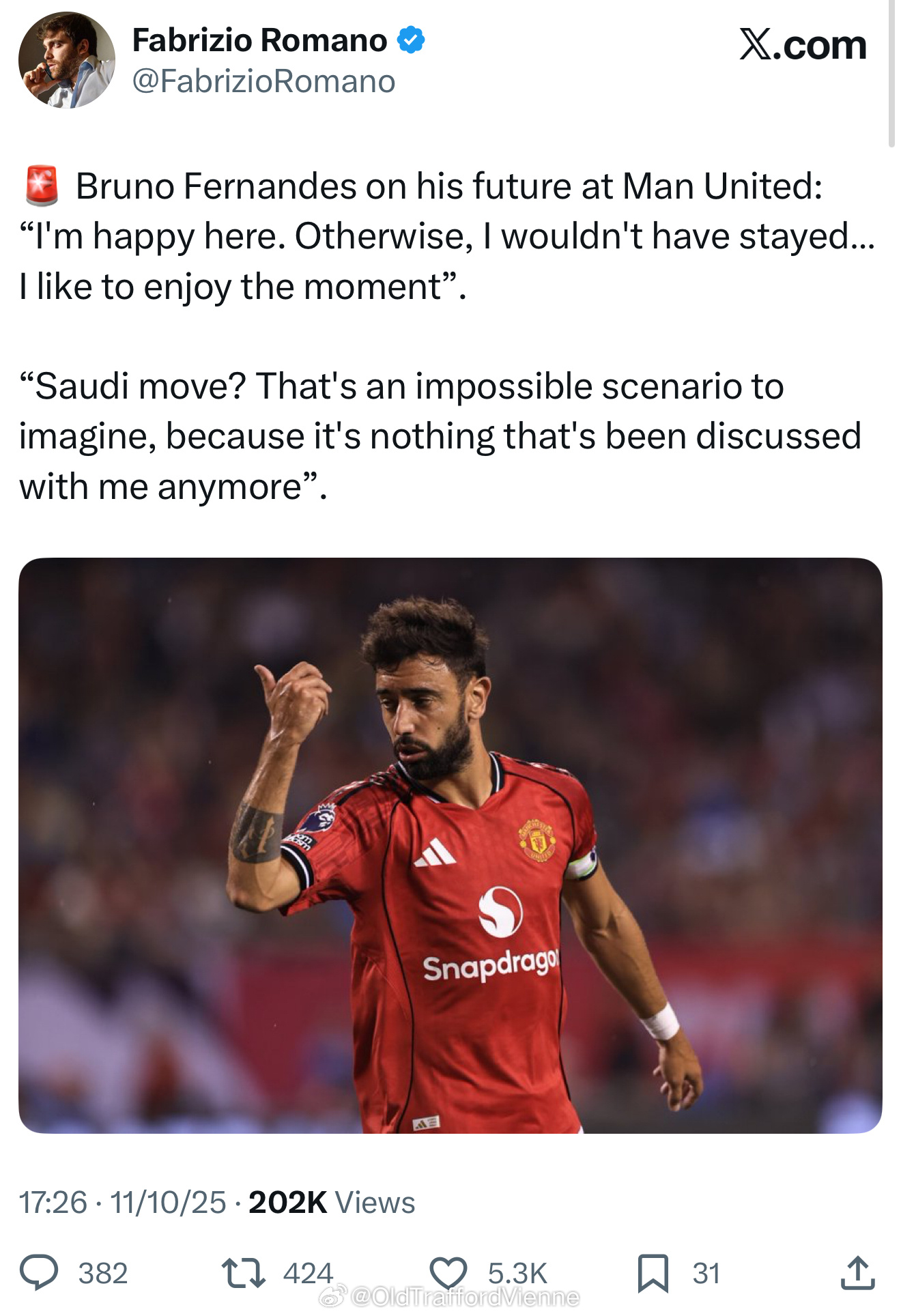 “我在这里很开心,否则我也不会继续效力。我愿意享受此刻。转会沙特?难以想象,因为相关谈话从来没和我发生过。”