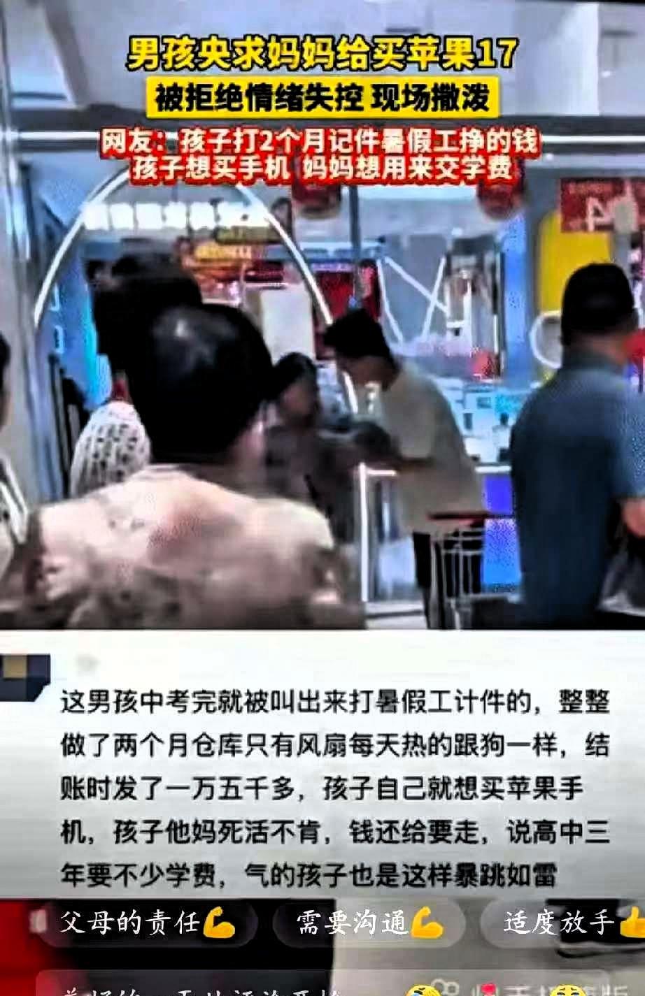 这是我挣得钱,我为什么不能买!”河南,男孩打暑假工赚了15000块钱想用来买苹果手机17,但妈妈不同意 河南男孩在手机店门口的哭声,真的太让人揪心了!中考一结束,别的孩子还在享受暑假,他已经钻进又闷又热的仓库干起了计件活。 仓库里只有台老旧风扇,吹出来的风都是热的,他每天弯腰搬货、核对清单,衣服湿了又干、干了又湿,后背结满汗碱也没喊过累,硬生生熬了两个月,攥着1.5万工资,满心期待想给自己买台苹果17。 这钱来得多不容易啊!是他用无数个汗流浃背的日子换的,没跟爸妈要过一分钱,连想买手机的念头,都是靠自己打拼撑起来的。可谁能想到,妈妈直接把钱收走了,说要留着交高中学费,连商量的机会都不给。男孩急得直哭,喊着“我自己挣的钱为啥不能自己说了算”,围观的人看着都替他委屈。 有人说孩子不懂父母的难处,可大家心里都清楚:就算没有这1.5万,父母也绝不会不让孩子上高中。妈妈的担心是真的,但错就错在不分青红皂白就否定孩子的努力。孩子要的哪里是手机,是自己的付出被看见、被尊重,是“我能靠自己实现愿望”的底气。 要是连自己挣的钱都做不了主,往后孩子还敢主动去拼、去争取吗?大家说说,如果你是这位妈妈,会怎么跟孩子沟通,既顾着家里的开销,又不凉了孩子的上进心?