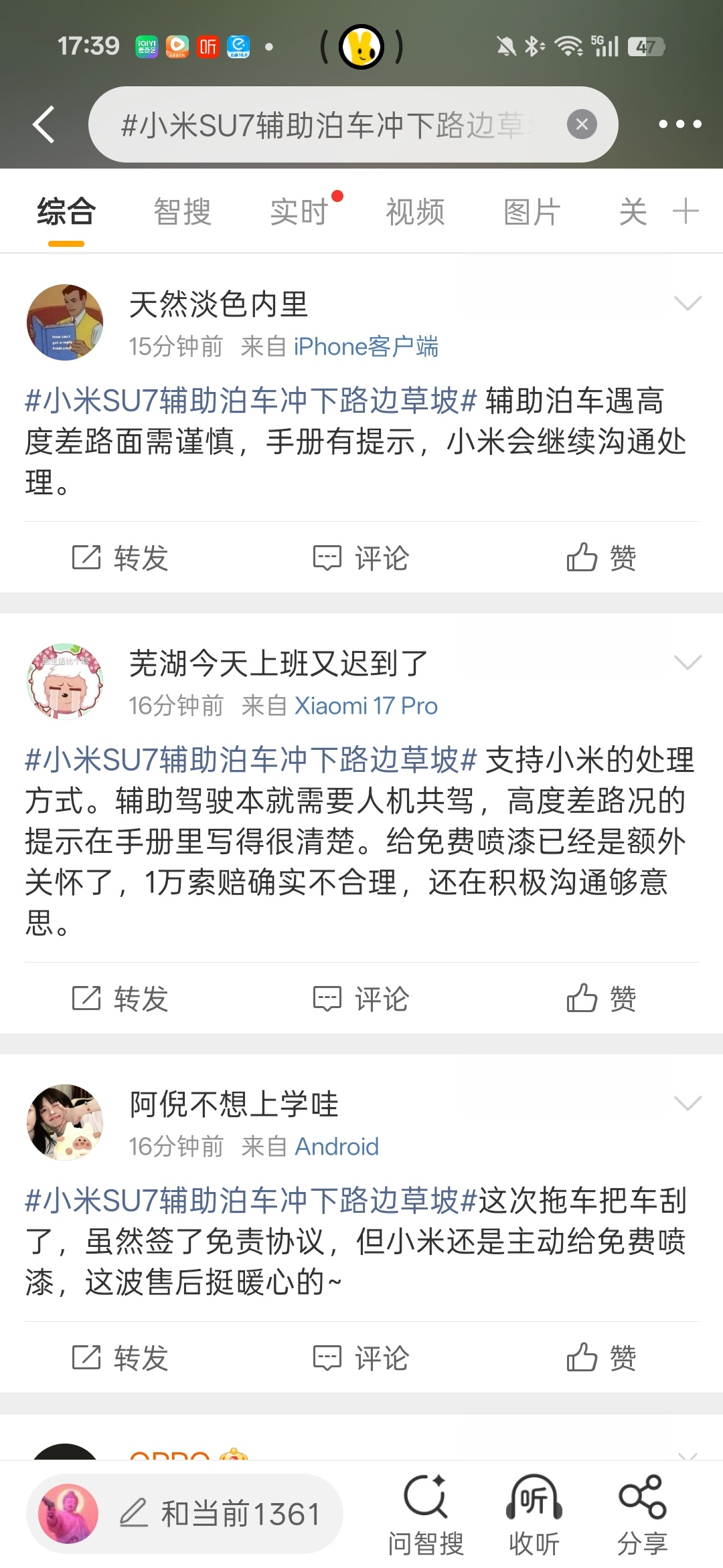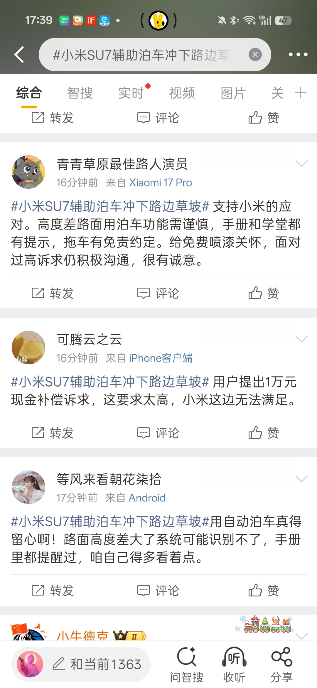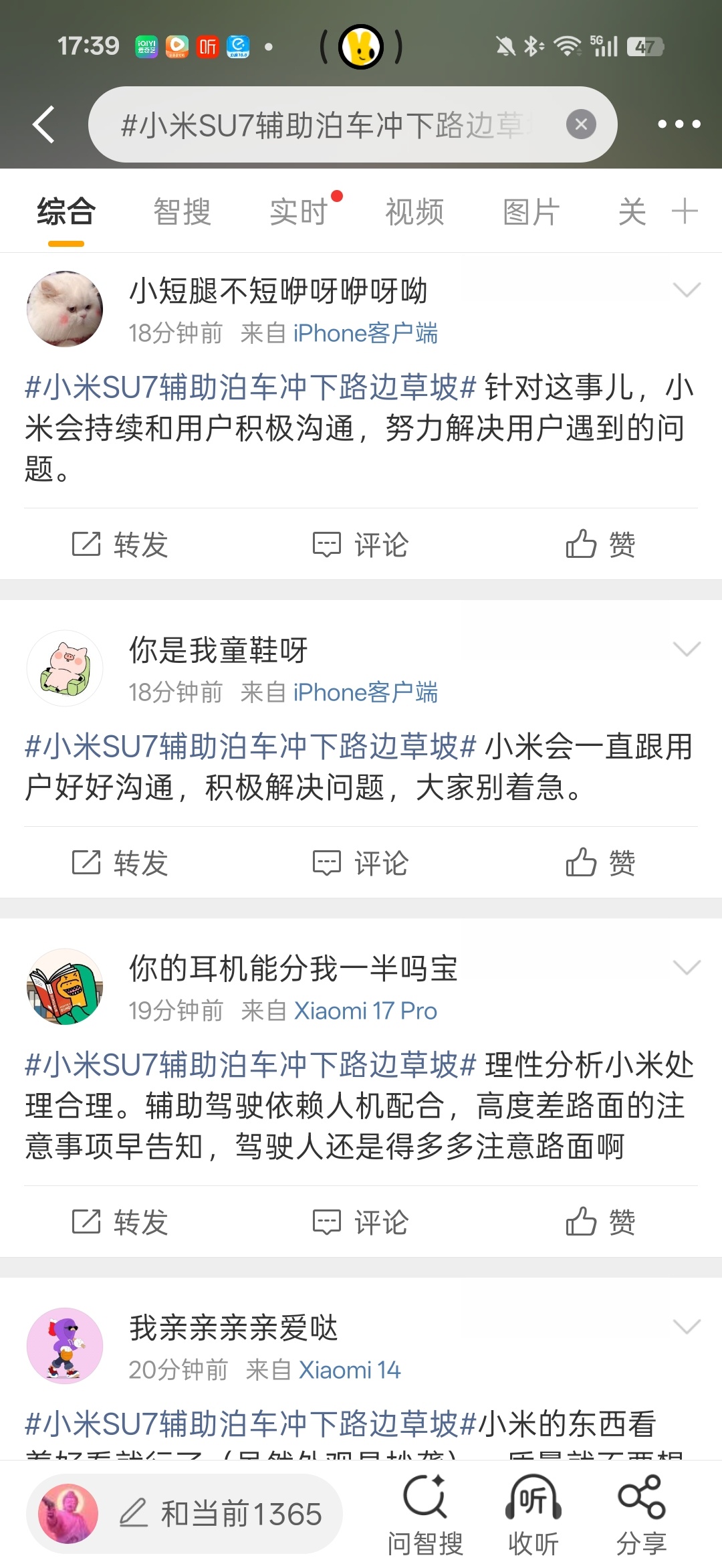 小米SU7辅助泊车冲下路边草坡怎么这个热搜冒出来这么多统一两句话的控评话术,正常用户看完整个视频我觉得都不会说什么,背后是谁再安排水军控评?[笑cry]