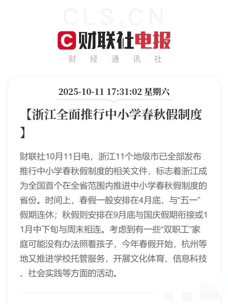 浙江全面推行中小学春秋假制度。 我真服了,我们毕业了什么都吻上来了是吗?我们那会儿疫情春游取消就算了,各个活动又取消。现在空调都装上了,我们那会儿用个大冰桶。