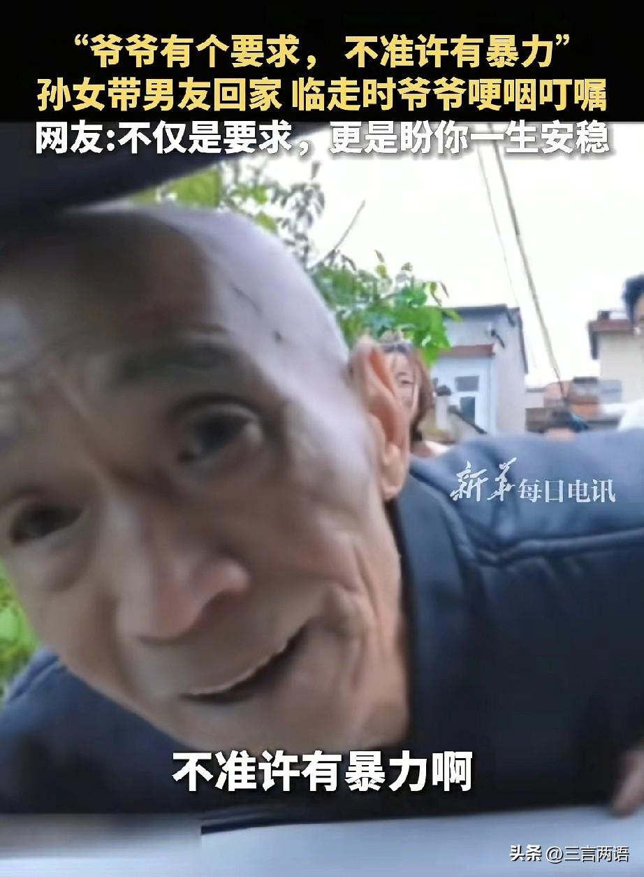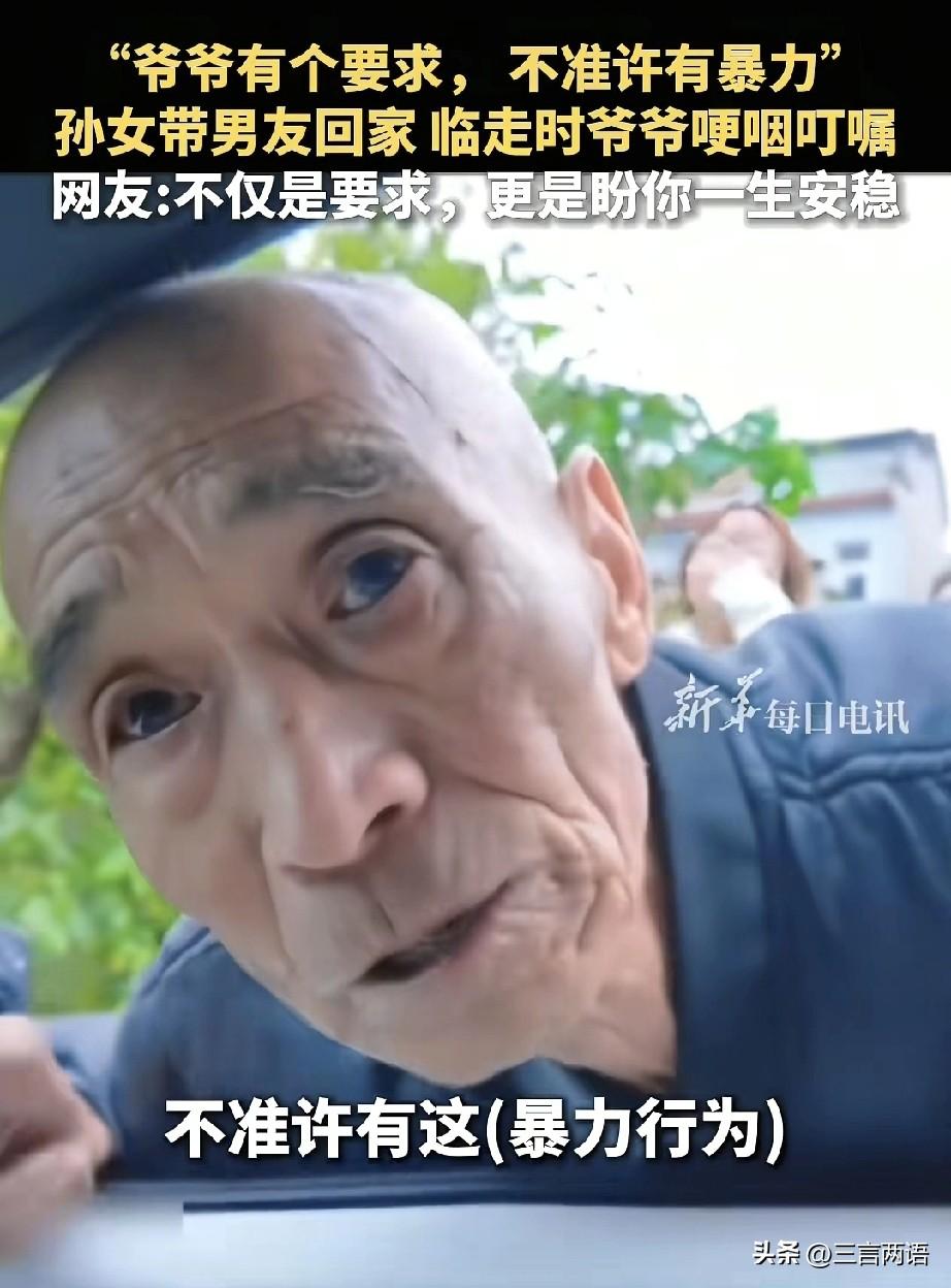 好感动!国庆节,河南一位姑娘带着男友回家见家长,临别时80岁的爷爷走到车旁,对孙女婿郑重地说了一句:“不准许有暴力啊,爷爷就这个要求!”孙女婿连忙回应:“不会的,爷爷您放心。” 原来,这位姑娘一直在外地工作,交往的男友也不是本地人。趁着国庆长假,她决定带男友回家与亲人见面,男友二话不说,驾车跨越两千多公里陪她返乡。 一家人对这次见面格外重视,兄弟姐妹也都专程赶回。80岁的爷爷尤其高兴,见到孙女的男友就亲切地拉着他聊天。几天的相处下来,全家对男孩的印象都很好。 假期转眼结束,两人一大早吃过饭准备返程。刚坐上车启动引擎,爷爷突然快步走来。道别时,他转向孙女婿,语气温和却坚定:“爷爷有个要求,不准许有暴力啊!”见男孩一时没反应过来,孙女轻声解释:“爷爷是说你不能打我。” 男孩立刻郑重保证:“爷爷,绝对不会的。”爷爷又叮嘱一遍:“千万记住,不能动手啊!”男孩再次承诺:“您放心。”爷爷点点头,重复道:“我就这一个要求。”直到男孩又一次应下“放心”,爷爷才挥挥手说:“那你们走吧。” 车子缓缓启动,爷爷站在路边久久凝望,眼角闪着泪光。那不舍的眼神,那一句朴素的嘱托,让无数网友为之动容。 有网友感叹:爷爷一定是个脾气特别好的人,看面相就特别慈祥,真心疼爱孩子。 也有网友分析:这真是爷爷的心里话。孙女嫁得远,家人最怕的就是她在外面受委屈。小伙子一定要记住这个承诺。 还有网友读出了更深层的含义:爷爷没说要多么宠她,只要求不能动手。你可以对她不够好,但绝不能动手。因为她是爷爷心尖上的人啊。 一句“不准许有暴力”,胜过千言万语。这不仅是爷爷对孙女的疼爱,更是娘家人为女儿划下的底线——你可以不爱,但不能伤害。 这句话看似是临别的叮嘱,实则是爷爷在用自己的一生阅历,为孙女争取最基本的尊重。也许有人觉得这是过度保护,但在我看来,这是一个长辈能给予孙女最珍贵的底气——无论走到哪里,都有人为你撑腰。 我相信,这句话在爷爷心里酝酿了很久。他一定反复思量该不该说、该怎么说。既想保护孙女,又不想让孙女婿难堪。终于在离别时刻,他用最朴实的方式,说出了这个唯一的要求。 (来源:都市报道)