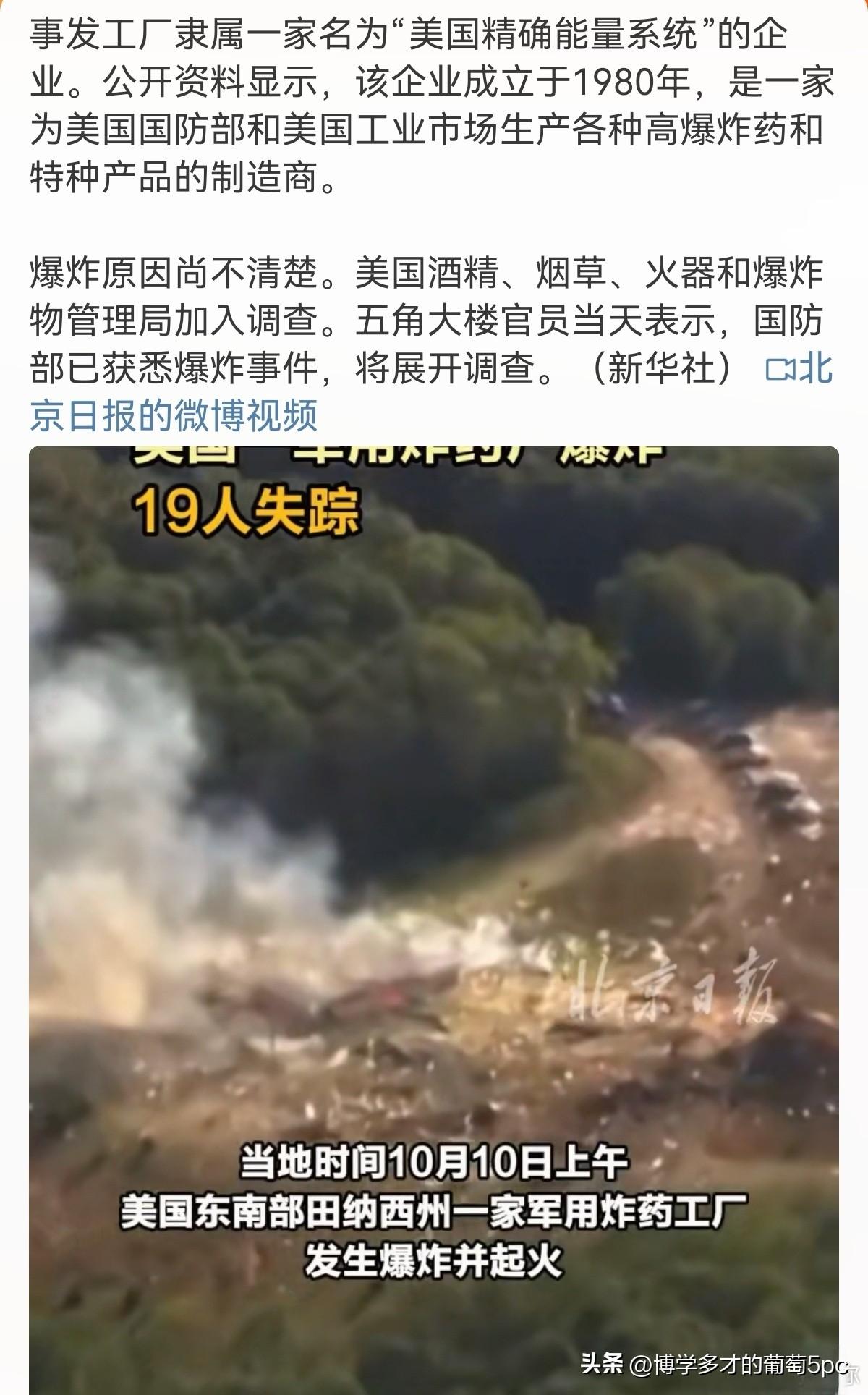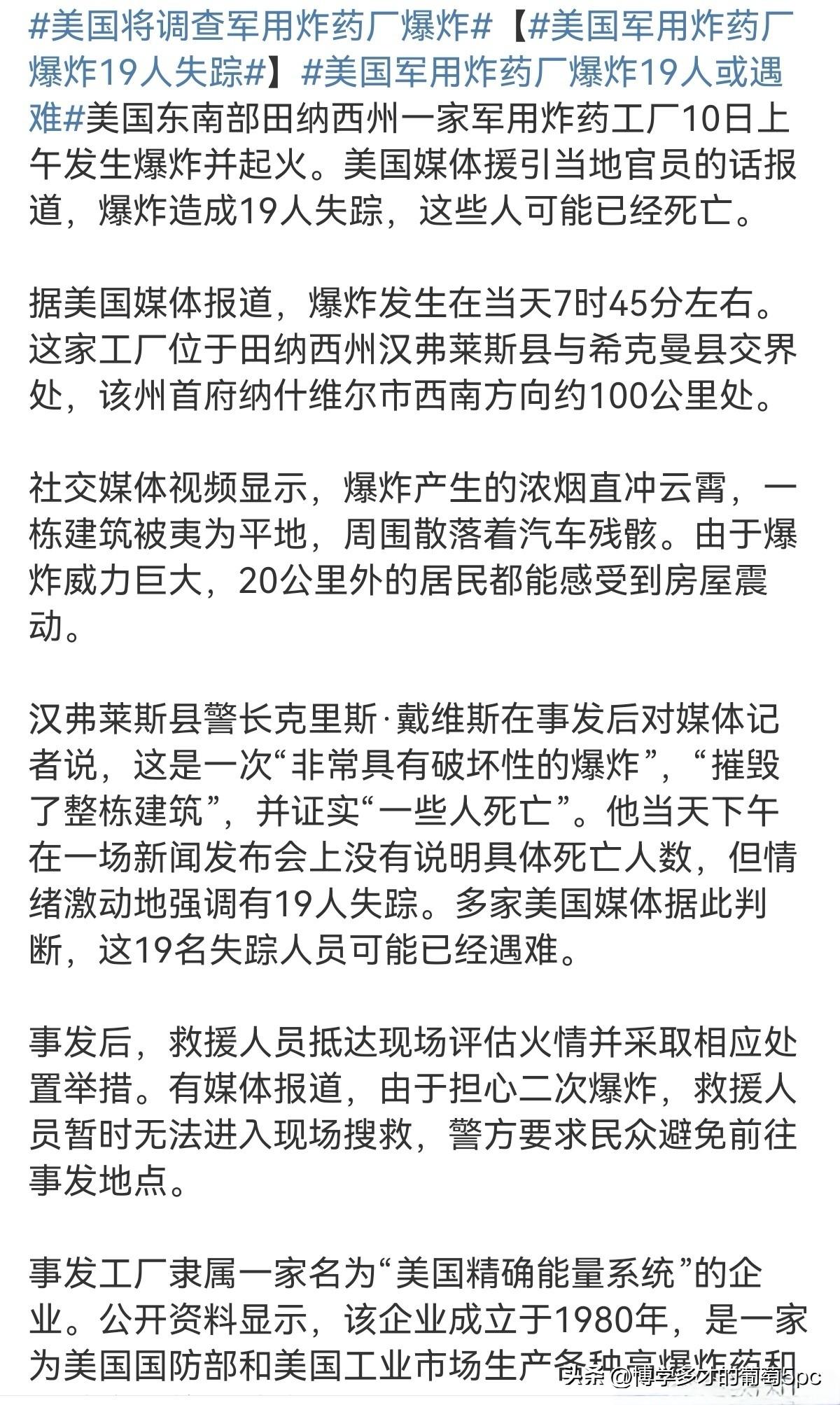 美国可能刚刚失去了它唯一的TNT生产线……10日上午,美国田纳西州一家军用炸药工厂发生爆炸并起火,爆炸造成19人失踪,19人或已遇难,具体原因尚不明确。 美国在1986年就停产了TNT,之后38年它一直是找其他国家购买TNT。 直到2024年,帝国才宣布要在本土重建TNT生产线。一边大兴土木建设新厂房,一边恢复现有军工厂的TNT生产能力。 当然美帝的基建效率嘛,大家也都知道,新厂房都排到30年后才能投产了。 所以美国现在仅有的TNT生产能力,完全是靠恢复生产的现有军工厂。 目前帝国境内有多少个厂家能生产TNT?这个没有数据。 但爆炸的这家“精确能源系统公司 (AES) ”,两个星期前刚刚和五角大楼签了一份生产TNT炸药的订单,显然是具备TNT生产能力的。 也就是说,如果没有其他军工厂恢复TNT生产的话。 帝国可能刚刚失去了它唯一的TNT生产线……
