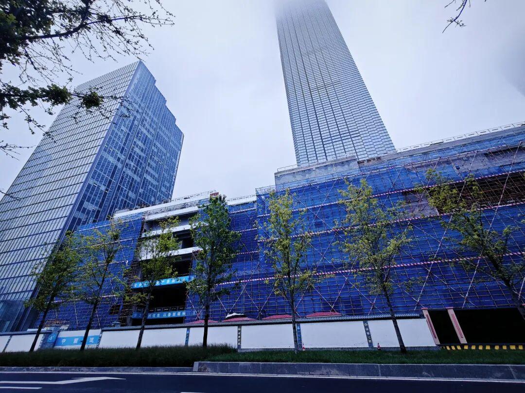 山东第一高楼又有新动静了,下面的底商围上了纱网。这底商好多年没有动静了。 目前大家都关注绿地山东国金中心的楼顶建设进展,但大家都忽视了底部的底商。绿地山东国金中心底商面积很大,大约有六层楼高,总面积6万平方米左右。绿地打算以后自己在这边开绿地的商业综合体品牌绿地大馆。 其实绿地原计划在旁边的低密度项目开个大馆里,可惜绿地现在这样也开不起来了,于是改成了国金天地。 这个底商主体结构封顶之后,已经有好几年没动静了。 这个底商不完工,绿地就投入不了使用。因为第一高楼旁边是个烂尾综合体的话,说出去也不好听,而且也不安全。 现在拉上了纱网,说明已经复工了。