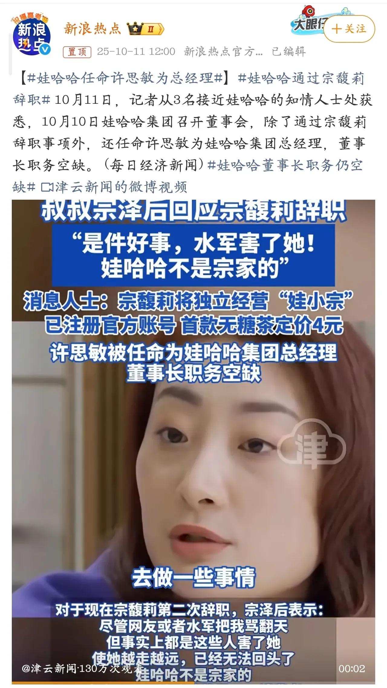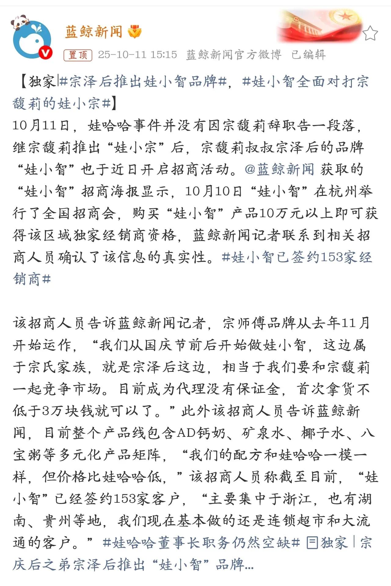 宗馥莉刚辞职娃哈哈,宗庆后之弟宗泽后就开始“落井下石”。对于宗馥莉落寞退出娃哈哈,离开这个付出几十年心血的企业,娃哈哈保持沉默,倒是宗庆后胞弟宗泽后立马站出来补刀,直言宗馥莉就是职业经理人,娃哈哈不属于宗家家产,就该夹着尾巴做人,都怪她锋芒毕露、德艺不行,当初还听不进他的劝告,才走到今天无法回头的地步。宗泽后更直白说,宗馥莉难堪大任,离开不是坏事。 这一长串表态,明眼人一看便知,其中净是怨念和幸灾乐祸的成分。本来是叔侄的亲戚关系,却给人落井下石的既视感,背后很难想象,这个宗庆后胞弟,同宗馥莉的关系有多差。甚至宗泽后此前还明确指出,宗馥莉对娃哈哈的贡献,远远比不上杜建英,也就是同宗馥莉争百亿遗产的真正对手。哪怕事实果真如此,公开站队“外人”,还是令人唏嘘不已。 不过看到宗泽后干的事后,一切也都说的通了。几乎在宗馥莉把娃小宗推到前台的同时,宗泽后推出了自己的品牌“娃小智”,而且动作更快,据称已有超过150个经销商签约。而且是在宗馥莉曝出辞职消息的同一天,宗泽后在杭州启动娃小智全国招商会。有签约经销商明确指出,宗泽后的娃小智就是要直接跟宗馥莉的娃小宗正面抢生意。更狠的是,娃小智几乎将娃哈哈所有产品线都复制了过来,而且宣称口感和配料同娃哈哈一样,价格却更低。 这样就不难理解,宗泽后表态的用意了。这对娃哈哈叔侄之间,早已不是什么亲戚,而是商场上的死敌了。不过就算宗泽后下手更狠,可跟宗馥莉坐拥整个娃哈哈几十年打下来经销商体系相比,还远构不成宗馥莉的对手。