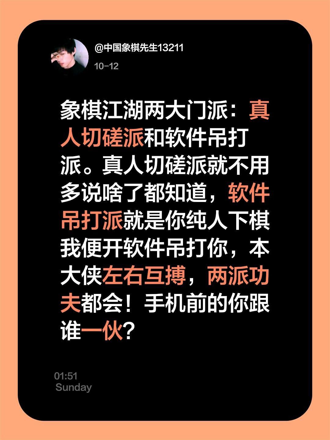 网络象棋高手门派划分?象棋江湖两大门派:真人切磋派和软件吊打派。真人切磋派就不用多说啥了都知道,软件吊打派就是你纯人下棋我便开软件吊打你,本大侠左右互搏,两派功夫都会!手机前的你跟谁一伙?象棋 象棋软件